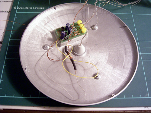 The tractor beam is a simple clear lampshade, but I wanted it to be frosted so that you can more or less only see the silhouette of the captured submarine inside. Why? Well, the boat was a waterline model, but I wanted to show it pulled out of the water, so I had to sculpt the rest of the hull. The result is convincing if you are not able to take a closer look... so I must do something to hide my sloppy sculpt job. Darn that Murphy .... I tried to frost it with a clear dullcoat, and at the end it looked like... well, a clear lampshade frosted with clear dullcoat. Hm. I put it in the shelf, maybe I can use it for a future project. A second attempt was made with a window tint color called "frost". I once used a a bottle of that stuff with a very interesting result, but this time - it dried almost clear. Hm. I stripped it, starting a third attempt with window color "mother of pearl". This time it is frosted very well - too well, to be honest. You won`t see the ship trapped inside. Oooooookaaaaayyyyy... Next I tried with a light blue window color. Nice effect, but you see darker lines where the painted areas overlapped. Now it looks like a clear lampshade painted with light blue window color. Hmblgrmpf!!! Think, Marco, think! There MUST be an option that will work. And yes, finally I have the idea that rescued me: Make the enemy to your ally! I stripped the blue color and applied it once again, but now swirling around like a mad scientiest all over the surface of the lampshade. The result is a cloudy appearance, looking a bit like some sort of plasma. Yesssssssssssss! The Alien Ship Time to build the saucer now (in fact, all those events described here took place more or less simultaneously, but you can follow the plot easier when told step by step...). It is a snap together kit with a really tight fit, so I didn`t use any glue (with the advantage to be able to open it for eventual repairs). First of all I test-fit all the parts, discovering no problem. The second step was to put the lighting set together: a small electronic board for a blinking effect with two 8 V minibulbs attached, and a second circuit with two 8 V bulbs and a 22 Ohm resistor. Everything is connected to a 16 V power supply. Uhm - two bulbs plus two bulbs are four bulbs... but there are only two provided in the box. Urgh! I e-mailed BUSCH regarding to that, and they send replacement bulbs within a few days. Ok, problem solved! Great service! I attached the two remaining bulbs to the circuit. Power on and... nothing. Well, something: The blinking lights are working, the constant shining (replacement) ones not. Hm. I checked all the wire connections, they were fine. Maybe one bulb is damaged (they are wired in line)? A quick test with an 8 V power supply for each bulb proofed that they are both ok. So it must be the resistor. I took it with me to the local electronic shop, telling the friendly guy there my problem. He looked at the resistor, then he raised his head, looking at me like I`m from another planet. "22 Ohm, you need?" he asked. "Yes, 22 Ohm. That`s what the instructions say." "This one has 1 kilo-Ohm. The bulbs cannot work with this one!". Aha! Great! An easy-to-build snap-together kit with complete lighting set: Two of four bulbs are missing, and the only needed resistor is completely wrong. Great service? So I purchased two ( "just in case", you know?) 22 Ohm resistors there. Back home I attached one of them to the circuit. Power on and - nothing. Aaaaaarghhhhh! Checking the wires again: Ok, my fault this time. The power supply was not in contact with one of the them. Once again "Energy!" - it works! Everything! So let's put the light into the saucer kit. The electronic board was glued into place, the bulb for the tractor beam also. Now to the top side: The two blinking ones are sticking in a solid clear piece to direct the light to the designated areas of the hull similar to the Bandai Trek-model system. Above that piece is an opaque one, followed by the bulb for the half transparent top dome. The opaque piece has a small depression for the bulb., which slips into its designated place perfect. Now just adding the dome and... huh? What`s that? The dome won`t fit - there is a 1.5 mm gap between it and the fuselage. But it was perfect without the bulb. The bulb! It is to long, preventing that the dome can be attached correctly. Hmblzfrgpflmph!!!!! All bulbs are of the same size, so once again this is obviously a mistake from BUSCH. Definitely NO great service... The only solution for this issue was to make a larger hole where the depression was, and a new deep depression in the clear light direction piece so that the top bulb will sit deeper. Been there, done that - now the dome fits. By the way, I`ve seen this UFO-model on several exhibitions before, build by modelers from BUSCH (promotional dioramas). Now I checked my pictures again: None of them has a lighted top dome! So they seems to be aware of the bulb problem. |