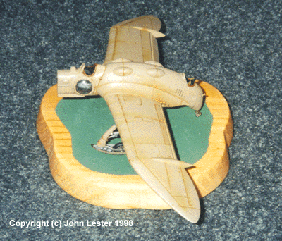 Ah, well. I started with the cockpits, painting all the details before fitting them in place. I was stumped on interior colors until Ledon Cook was kind enough to forward me some scans from a book he has. The instrument panels were painted Flat Aircraft Interior Black with red and green details (as usual, all paints I used are Testors Model Master brand). The seat, frame and stick were painted black as well. Seat cushions were painted tan. The gunner's stick should have more knobs and levers, but they would be too small I decided they were more trouble than they were worth to scratchbuild. The interior of the cockpits is shown variously as a black, dark brown or reddish brown - I painted mine a dark, chocolate brown (RLM 61). Before gluing the fuselage halves together, I dipped the clear parts in Future acrylic floor polish to make them shine, and to smooth out some of the distortion in the big "Omu eyes" in the forward cockpit. These I installed with thinned white glue after the Future had dried. Gun barrels were painted steel and glued in place. The rest of the craft practically fell together. The wings went on with no need for putty. I probably should have inserted the flaps in their slots before gluing the wing halves together, but they were easy enough to (carefully!) bend and slide in position. Wheel wells were painted the same color as the cockpit. I should have probably painted the engine bays this color as well, but the drooping flaps hide this area so I didn't bother. Landing gear was painted with chrome silver (springs), aluminum (oleos), copper (knobs) and main body color (more on this in a minute). I stuffed toilet tissue in all openings and prepped the model for the base coat. In the story, the Gunships are made from a special ceramic material. To replicate this, I mixed equal parts of Flat Dark Tan and Pactra's Copper, thinned it, and airbrushed the whole model. After this had dried thoroughly, I applied a wash of Field Drab to all the panel lines. I followed this up with airbrushed streaks of Field Drab across the fuselage and wings in the direction of airflow). When all this had dried, I affixed the landing gear with superglue and glued the model to a specially-made wooden base. (Shaped with my bandsaw from 1/2" pine, stained, painted and sealed). The result is a real head turner - not so much because of any skill on my part, but because of the unique design. This was a fun kit to build and well worth the pittance I paid for it. The Mave should be just as good .... |