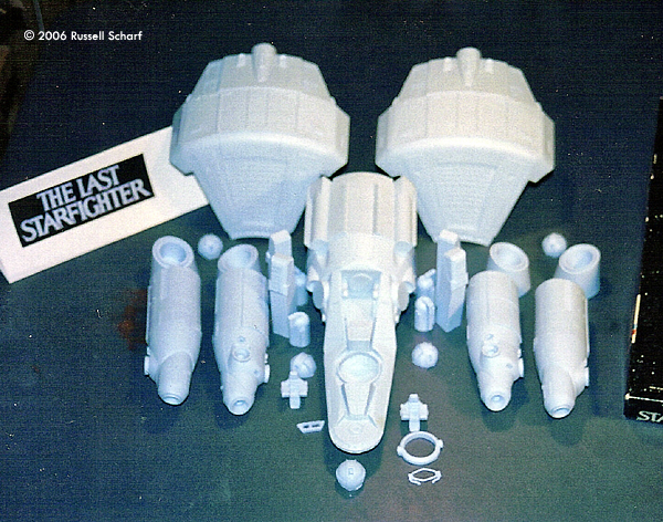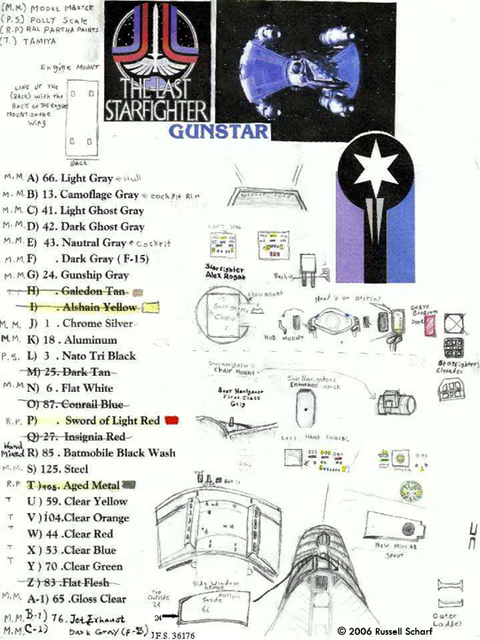 Little did Alex know that he was in fact being tested, and would soon be millions of miles away from Earth facing the ko-Dan Armada in the very last Starfighter. Overall Impressions This is a great kit but I wish it was a little less expensive. Is it accurate? It's really close! The design and the overall shape are perfect. However, some areas and details need work and can be made to match the original relatively easily. The resin is really easy to work with. If you plan to modify the kit you'll be surprised how fast you'll have a pile of resin dust.What You Get The kit comes in a very sturdy box and the parts are packed really well, with most wrapped in bubble wrap. The small parts like the seats are in bags and the rest are packed tightly in styrofoam packing peanuts. This kit has 40 detailed Gunstar parts, plus 4 brass rods that you are supposed to bend into the aft guard rails to protect the aft ball turrets (the instructions have a template showing how to bend the rods into the correct shape). Also in the box are 3 clear acrylic rods with which to mount the model to the base provided. I found out that the rods were cut uneven when I got them, I ended up shortening them and making sure that the rods would match up to the angle in the base and keep the model from swaying (back rods 6 1/2" and the front rod 7 3/4"). The last resin part is the Base which is shaped like the outline of the heads -on view of the Gunstar. Also in the box is a picture of the "suggested" paint scheme for the Gunstar. Assembly I followed the instructions basically just to see where all of the parts go. I had a little problem attaching the gunpods (wings) to the hull. They wouldn't fit flush to the hull. To make sure that the gunpods would have the correct curve at their roots, I wrapped sandpaper around a small spray can and sanded from the center to the outer edge. I also had a little trouble attaching the engines to the mounts on the gunpods, There are indents in the mounts that are supposed to match up to the pins on the engines, but not all of them would match up to each other, so I ended up making a pattern out of one of the mounts to make sure that they all would be equal length to each other. I ended up not using one piece that looks like two framed-out monitors that's supposed to go in front of the Starfighter's (pilot's) chair, what looks like where the instruments are in any of today's modern combat aircraft. I also decided to remove and rebuild the rectangle area that looks like air vents. I then modified the chin armor which protects the Starfighter's side windows. I ended up removing a lot of resin around these windows; there were a few holes after I moved the side windows in. I deepened the area around the windows as well. I found a easy way to fill holes in tight areas like around those windows that worked well for me: Superglue-covered tracing paper. After the superglue cures just putty over the area and you can't tell there wasa problem! I did this instead of filling the hole with putty since the hull is hollow and I didn't think I would have enough putty for the whole hull (plus I didn't want the putty to damage the Starfighter's chair well!) The Starfighter's seat has 2 parts, an outer ring and the seat that you are supposed to just attach to the corner edges of the the ring, but if you watch the movie you'll see that is not the Starfighter's seat. I made spacers for the seat and reworked the controls' shapes and colors for both Starfighter and navigator's positions. I also reworked the Navigator's seat. WARNING! While you are cutting out the navigator's area you can accidentally remove the top edges leading to the pilot's (front) area (I had this problem) where the canopy rests. Luckily, the edges can be easily fixed. After I attached my canopy I filled the area with Microscale Industries Micro Kristal Klear, which fills the area well and can be painted over. I also used kristal klear to attach the canopy. In front of the cockpit, I dug into the flat circle radars to make the correct concave dishes. After I attached the gunpods (wings) and before I attached the engines I decided to attach the thrusters. I found an easy way to get the thrusters to all point out at a 45 degree angle to each other. There's a line running in between the big solar panels and a grid inside the thruster. I just drew a line in between them to get the correct angle. Now to the weapons. The ball turrets ended up being the easiest to modify. I filled the area where the barrels are with putty. The barrel was taller than the rim so I just cut off the excess.After sanding, I hand-drilled out the barrel with a sharp x-acto #11 blade. The other guns that sit in front of the landing gear were a little harder to modify. I worked down the flat area near the barrel and where the curve ends I just followed the edge around to the barrel. I cut the box in front of the barrel down to just three thin walls, with the missing wall facing away from the barrel. I then removed everything inside the walls all the way down to the top flat part of the gun. Now there were just a few things left. When you see the gunpods for the first time in the movie, where the Death Blossom Doors are you'll see bars running down the length. Only a little area around the missile barrels is all that is actually present. There's a picture of the Gunstar 1 that I got off the internet that shows a shadow cast down the length of the doors from the missile barrels, and I could see how the molder of this kit would mistake that shadow for a door length bar. And there are two small rectangular boxes on the model's starboard gunpod but that is where red markings go instead. I also changed what I guess are smoke vents at the top of the doors. The other area that takes some work is the bottom (ventral) hull where the Starfighter's windows are. You can see a mark on the bars running the length of the lower hull; I made a channel the width of the mark all the way down a