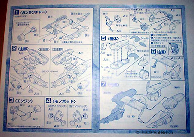 (Jet Black, Faye Valentine, Edward the hacker, and Ein the dog), as they race across the galaxy on daring adventures. They are bounty hunters struggling to survive in a universe that is a strange combination of past, present, and future. With each new bounty that they go after, new characters are introduced, and new cosmic landscapes are explored. The Red Tail is the personal ship of Faye Valentine and it is the second new Bandai limited-release kit (the first being Spike's Swordfish II) for this anime. Faye's Red Tail is a MONO Carrier with vertical take-off & landing capabilities and heavy armaments (MONO stands for Machine Operation Navigation of Outer space). A variety of equipment can be added in modular form to the ship, making it a flexible multi-purpose craft. In its basic configuration, Faye has it loaded with weaponry, both bought off the rack and customized with her own unique specs. Cowboy Bebop was, at the time of this writing, airing on Cartoon Network's Adult Swim on Saturday nights. The series is also available on video and DVD. What You Get Inside the box you'll find a small sheet of five self-adhesive stickers, the instructions pamphlet, two sprues of light-colored lavender plastic parts, two sprues of medium-gray plastic parts, one sprue of flesh-colored PVC parts and one sprue of clear plastic parts with a golden tint. Typical of today's Bandai kits, there is no flash on the parts that I could see, and the detail is above average. As for accuracy, heck, it looks like the ship from the TV show to me! The kit has a removable cockpit pod and sports dual "arms" with gatling guns and missile launchers. Although I have not done a test fit of the parts, if this kit is like all other modern Bandai kits, there should be little or no seam filling required. I'm glad that the clear parts are gold-tinted. Bandai must have had complains about the clear parts not being tinted on the Swordfish II kit. Three large figures of Spike, Vicious and Ed, plus one of Faye flying the ship, are provided on the PVC sprue. Since these do nothing for the kit, IMHO, I will probably discard these figures with exception of Faye's, which goes inside the MONO pod. The instructions leaflet is on black and white… uh, blue and white. It consists of seven steps (plus an optional one) with corresponding exploded diagrams. The text is all in Japanese characters although it should not present a problem, with the exception of the paint guide. Unless you can read Japanese characters, you will be using the box pictures as a painting reference. |