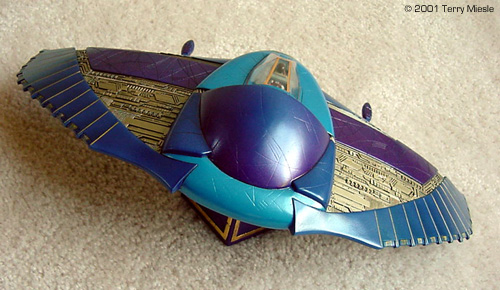 It is a show which “gets it right.” It uses many of the same stories familiar to SF and drama series, but does them better than most other shows. I recommend you watch it when you get the chance. The premise of the movie and series was simple. All those gods we believed in were actually living entities, but they’re not gods, just very powerful aliens. Most are still alive. The Goa’uld and Tokra are symbiotic life forms, similar to the Trills in Star Trek, but with an attitude. The Goa’uld are universally evil, taking the form of gods using technology to dazzle and enslave less advanced civilizations. They dominate their subjects and use them for nefarious purposes. The Tokra are also symbiotes, but are at war with the Goa’uld, and are fairly obnoxious in their own right. The Asgard are another ancient race, typical grey aliens, and are also at war with the Goa’uld , though these guys are more benevolent. The Goa’uld are at war with one another too, as though they didn’t have enough trouble already. Ship design does not play a primary role in Stargate. The capital ships of the Goa’uld are generally Egyptian looking, featuring pyramids as a basic shape. The Goa’uld employ a number smaller craft, including this Death Glider. It is armed with a pair of main guns which are larger versions of the hand-held staff weapons used by the Jaffa. These fighters are capable of operating in atmosphere or vacuum, and are highly maneuverable. They apparently use the same gravity drive as the other ships in the series. The Model Warp has a winner here. The casting is crisp and details are very good. There were few pinholes, and a minimum of flash or mold lines. The fuselage is cast as one hollow piece. The half-figures are nicely sculpted and well cast in soft white metal. You'll have to decide for yourself whether you want to build them into full figures and scratchbuild a full cockpit or just paint the floor black and ignore it. The bad part about all of that is the resin WARP uses. The mold release was very strange stuff, it seemed like petroleum jelly and smelled of honey. This required dish soap and a toothbrush to remove, which did grind into the surface a little. It is GRP resin, a polyester, with microbubbles included to extend it. This meant that when I sanded any area, including removing mold lines, hundreds of tiny bubbles were exposed, which had to be filled as well. Exasperating. I had to do a lot of filling with Gunze Mr. Surfacer 500 and 1000 (fill-n-sand) and I used a sandable primer from Krylon. This let me fill the areas, sand, fill, sand and even sand the entire model to a good surface. To say the least, that part of the building was very frustrating. The cockpit tub and the guns were cast in good resin, light tan polyurethane. These were very nicely done. The canopy was cast in tinted translucent resin. One copy I saw was a pretty cool light purple, the other a dark blue. Both canopies I saw had major problems due to the mold release - it actually left indentations in the surface! Additionally, there were pits and bubbles in the clear resin, not good. I polished the blue canopy until it was relatively clear. Then, while cutting off the excess resin, I broke it. After considering scratchbuilding a canopy framework I decided to heat smash a new canopy over the remaining one. I slathered the intact purple canopy with Mr. Surfacer 500, sanded and polished it smooth. Using that as a positive master, I heat smashed a new, clear canopy. This was polished and coated in Future. More work than I wanted, but the clear canopy is better. The glass in the series does have a tint, but I think it's more like a Chevy Lumina minivan's glass - metalized or polarized. Strips of Bare Metal gold foil is the framework color. I primed the model with sandable primer as I said earlier. This was wet-sanded smooth and primed with white paint. After priming, the painting of this kit is an exercise in pearlescent paints. I used Testor's Acryl Pearlescents: True Blue, Deep Pearlescent Purple and Grape Pearl, and mixes thereof. Additionally, for the "feathering" effects I darkened the base color with Tamiya smoke and for the pretty light blue, I added silver and white paint, making it slightly more opaque as well. Most entertaining, even with all the masking. The gold areas are Testors Acryl Brass. This color matches the gold parts of Goa'uld ships almost perfectly, and using two coats covers even darker backgrounds very well, I was pleasantly surprised. The fine gold lines you see were applied using a cheap gold ball point gel pen obtained at Michael's Craft store. It can be wiped away with a moistened finger and completely removed with an alcohol swab. Do this over a protected surface; I had about 3 coats of Future over the entire model when I did this. The large gold detail areas were washed with black oil paint to bring out highlights and increase contrast. |