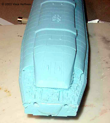 Painting Now came the fun part! Prior to painting, the model was mounted on a temporary stand consisting of a 2x4x12 and two wood dowels pressed into the model's existing mounting holes. Step 1: Priming the model After the model was assembled (without the truss in place) it was sprayed with Duplicolor automotove sandable primer and checked for any last minute touch-ups. A few seams were found and filled. Then the model was shot with a second coat of primer where the touch-ups occurred. Step 2: Painting the details The gray primer makes a very good, smooth base coat. On top of the primer, a series of acrylic dark gray panels were airbrushed using Post-It notes as masks. Panel highlights were applied along the scribed lines, and added in between the scribed lines to give a greater depth of detail. Once the various panels were painted, individual details are picked out and panted colors other than grey. The panel highlights and additional colors give the model a little more visual interest rather than being a homogenous grey space torpedo. Step 3: Sealing the paint Once again using my airbrush, a clear gloss acrylic was sprayed over the entire model. Every detail and surface was covered. This layer acts as a barrier between the paint below and the oil wash to come. A full 24 hours were given to allow the gloss acrylic to cure completely. At this point, the decals were applied and another coat of clear gloss sprayed onto them as a sealer. |