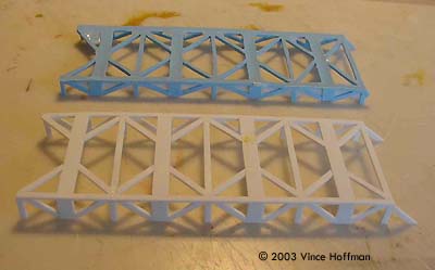 Minor problems As with most resin kits, there are trials and tribulations. Fortunately with this kit, the problems are few and most casting flaws are well hidden. The most obvious problem is a latticework part that attaches to the bottom. This piece was cast using an open-face mold and warped badly, and the worse side of the piece would be clearly visible once in place. I replaced this piece with a scratch-built assembly - more on that later. On the front section, there are some scribed panel lines which appear to have run off the scribing guide. These can be repaired by a small amount of filler and re-scribing to the original panel line location. There are also numerous erratic scribe lines on the bottom of the model and on the 'pontoons'. Filling with putty and re-scribing can also fix these. This model, however, was built correcting none of the scribing flaws, but I just couldn't help myself when I saw just how badly cast the truss was.The Truss Scratch building the truss, which runs along the lower-rear portion of the model, is not difficult, although your ability to accurately cut many identical parts will determine your level of success. I started by test fitting the kit part, to see how well the part fit, and concluded that it was ¼" narrow and ½" short and didn't align well with the details around it. Taking the new dimensions into consideration, the latticework size and spacing was measured and individual parts were cut from strips of plastic. Patience is required while cutting and assembling, but the results were well worth the effort. |