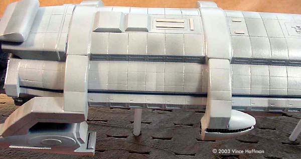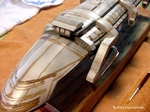 Step 4: Applying the wash An oil wash was prepared using artist oil paint 'burnt umber' and paint thinner. It is very important to use only paint thinner or mineral spirits, and nothing stronger (Testors airbrush thinner is too strong) and don't even consider using lacquer thinner, this will easily dissolve your acrylic paint. The wash was strained to remove any un-dissolved lumps of paint. A small pointed brush was used to apply the wash to all details, scribed lines and any other detailing that deserves a little shadow. The wash was left to dry for 2 to 3 days, or until completely dried. Step 5: Removing the wash After the oil wash was dry to the touch, I lightly dampened a lint-free rag with thinner and used it to remove the excess wash. Working in small areas, the rag was wiped perpendicular to scribe lines and details. To remove more wash, the rag was wiped parallel to the detailing. Paper towels should never be used to apply or remove a wash as the fibers in the paper will pull apart and stick to the model, and the roughness of the paper will scratch the painted surface. Step 6: Drybrushing After the model had several days to dry, it was ready for drybrushing. Once again, artist oil paint were used. White paint was mixed with a small amount of black to create a very light grey color, which was then applied using a large, soft round brush. Highlights were applied to most of the raised detail, as well as to lighten areas of the paint which turned out too dark. Oil paints make for excellent drybrushing because the drying time is greatly extended, allowing you to work the paint into very soft highlights on the model's surface. ![]() Step 7: Finishing After the drybrushed paint had several days to dry, the engines and windows were painted, and a black wash is added to the series of shuttle bay doors that run down each side of the ship. The windows were carefully painted using a fine line painting pen I found at my local art supply store. Flat white acrylic paint, thinned 1 part isopropyl alcohol to 4 parts paint, was used. Each window was then carefully 'dotted' onto the model. Engines were painted Testors Silver Chrome Trim and, after drying, painted acrylic clear blue. This gives the engines a reflective appearance. After the paint dried (once again) the entire model (except for the engines) was sprayed with a thin coat of clear matt acrylic and mounted on the permanent oak wood display stand. Conclusion Although this is an obscure subject, getting only a few seconds on the screen, I enjoyed building and painting this model and it looks very impressive in my display case. Construction was very simple, so I consider this an excellent model for novice resin kit builders and perfect for those advanced modelers who wish to hone their painting and weathering skills. |