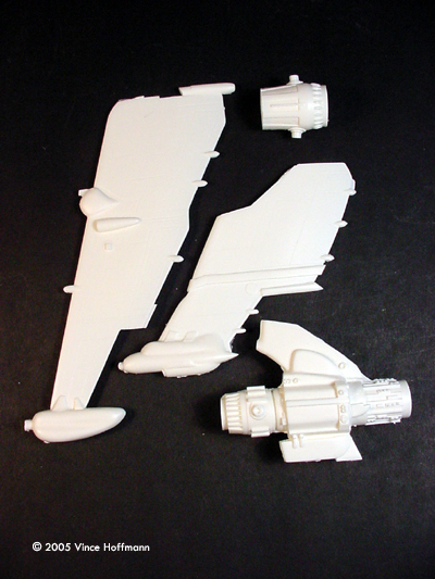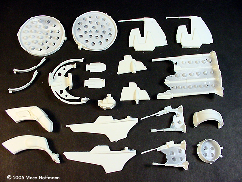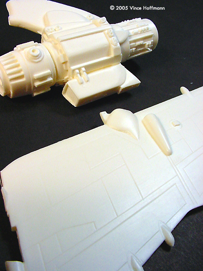 The Kit The kit, produced by Scale Model Technologies, arrived in a sturdy cardboard box with the parts bagged into three separate plastic bags: small parts, large parts and clear dome halves. The large parts are very nicely cast, with minor seam lines and flash around the edges, these will be easy to clean up. The small parts have an excessive amount of flash still attached. (Note: most of the flash was removed prior to taking photos of the parts.) and the clear parts are rather thick, with a slightly cloudy appearance. As with most resin kits, there are trials and tribulations. For this kit, cleanup of the parts will be the most time consuming. The fit of most parts is very good, although pinning will be needed to add strength to the wing and engine connections. The clear domes also appear to be in need of attention, several small ridges and minor defects will need to be sanded and polished in order to obtain a glassy smooth surface. This kit was created using a CGI model for reference, not reproduced from a studio model. |