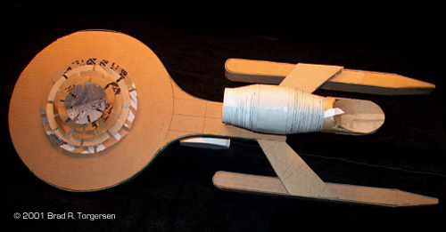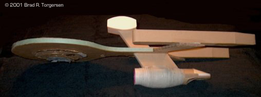 Getting back to the saucer, the final step in completing and smoothing out the central bulges is to glue down the gutted and notched paper edges of the successively smaller circles of card stock centered on the dorsal and ventral surfaces of the saucer proper. This begins the 'smoothness' effect. Next step is to smear glue all over those central bulges and then paste down wedges of thicker card paper, spoking radially out from the centerpoint of the bulge and the saucer. Card paper stock is best because it really yields a nice smoothness that will almost entirely conceal the true step-built structure beneath. Using lots of glue also helps because it softens the cardboard and will harden everything into its newly 'curved' and 'smooth' shape when dry. With all of these primary parts in place, it was time to start putting them together.Step 1: Mate the saucer to the secondary hull with the dorsal structure. This is much tougher than it looks because you don't want to wind up with odd angles that have the saucer 'drooping' in regards to the lines of the secondary hull. There is a side-on picture of the U.S.S. Paladin here that reveals that there is still some 'drooping' going on; a fact that will probably drive me to attempt this design again at some stage. Anyway, along with trying to avoid drooping, I was trying to keep the secondary hull centered on the dorsal structure when looking at the ship face-on. It's too easy to have the secondary hull be too far to the right or left. Once it was just right (or as good as I could make it!) I let it sit in place, using elastic bands to hold the components together while the glue dried. I used LOTS of glue on the joints between the saucer and the dorsal structure, and the dorsal structure and the secondary hull. This pays off because when the ship was done, I could literally drop it on its beak and the thing would not even crack. Again, I build these things to be sturdy so I can throw them around. I hate being delicate with models! Step 2: carve out the sloped shuttle bay doors and the concave portion beneath them. I used a serrated kitchen knife for this. I just cut angles at the rear of the secondary hull, one from the top and one from the bottom. Paper card stock was then glued into the wounds until nicely curved surfaces remained. As with the curved saucer section surfaces, lots of glue helps because it softens the cardboard to the shape you want, and then dries that shape rock-hard when done. Step 3: Mate the warp pylons to the secondary hull. This was perhaps the trickiest part, and it all had to be done by eye alone. It's easy to place the Pylons too far forward or too far aft, give them the wrong angle, or not seat them deep enough into the cardboard of the secondary dull. A carpet razor was nice because it carved good, deep notches in the secondary hull into which I could stick the small ends of the nacelle pylons. I dumped in a ton of glue too so that it would all set up right when it dried, and then I played with the angling for a few hours (at least) to get it looking the same as the schematics in "Mister Scott's". If I recall, even after this all dried up, I realized my angles were wrong and I had to tear it all out and start over again! ARGH! Step 4: Mate the nacelles to the pylons. Again, easier said than done, and all by eye. Same as the last step, with similar frustrations. Case in point: the Paladin has a port nacelle that is placed wrongly, perhaps a quarter of an inch further aft than the starboard nacelle. What's more, the port nacelle is drooping ever so slightly!! ARGH! Flaws I did not see until months after I was totally done with the ship. I probably could have ripped the nacelle off and tried again, but I did not have the energy for it. I figured I'd try another ship at some stage. Step 5: Finish the 'open edges' off. This whole time the ship looks pretty ugly because the entire edge of the saucer, the dorsal and ventral surfaces of the nacelles, and other structures, all were wide open with only the stacked board in between the main panels to give them proper thickness. Using stiff card paper stock, I scissored out long strips of edging material that was glued along these open surfaces, to totally enclose each component. Likewise, I used the same card paper stock to create a shallow cone which was placed point-aft into the front of the secondary hull to form the concave navigational deflector dish. At this point, the ship was really starting to come together, and was looking nice. The unfinished Archer-class ship photos show what the Paladin looked like at this point, with all open space closed up by finishing panels glued along joints. Step 6: Cosmetic structures. The bridge. The ventral saucer sensor arrays. The impulse deck. The tail 'fins' on the warp nacelles. And especially the photon torpedo bay at the base of the dorsal structure. All card stock, all easy to cut, glue, and forget about. But I had to wait until the entire thing had dried totally for three days before I dared to touch it. Step 7: Whitewashing. I learned early on that even heavy typing paper is not thick enough to get rid of the dark browns and other colors of the cardboard. Like house painting, it takes two 'coats' to get a good 'finish', so before ANY artwork or other drawing could be applied, I had to paste on a layer of plain white paper from bow to stern. This was very time consuming, but therapeutic. I'd smear and wipe one whole side of paper section after paper section, pasting them to the ship one at a time. Each section overlapped with the others so that the 'whitening' would have no gaps. When it was all done and dried, this initial whitewash increased the overall strength of the model quite a bit. By this time I could drop it, knock it around, and it would stand up just fine. Step 8: Artwork. This is where "Mister Scott's" paid off big time because I could literally copy each and every line from the schematics onto the outside of the ship. 