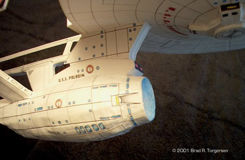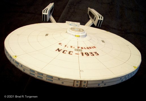 The U.S.S. Paladin, NCC-1933, is my latest incarnation of the so-called Constitution-class '2270 Refit' design, first seen in "Star Trek: The Motion Picture®". I built the Paladin in 1995. I've been building and rebuilding this design (my favorite among all the various Enterprise designs, from film or television) since 1987. With each new version (I think the Paladin is #5?) my technique, scale, and detail gets a little bit better. But as many other modelers out there can probably attest, the quest for perfection never ends, so this probably will not be my last attempt at the motion picture-era Constitution vessel. The whole reason I first started building Federation ships from scratch was because I was very unhappy with the plastic model kits. A seasoned military airplane modeler, I was not pleased with the flimsy plastic NCC-1701-A models I had bought in stores. I wanted something that I could throw around the room a little and not have it fall to pieces. I also wanted something a bit more manageable as far as size goes, and that I could fit on my desk. So, I set about trying to piece something together with what little material and tools I had back in 1987. I still use pretty much the same materials and tools to this day, and so far as I know my methods and application are pretty unique. The U.S.S. Paladin is one of my best 'paper and cardboard' ships, though I have built Excelsior-class and Miranda-class ships, as well as a host of my own 'Fanship' designs, using the same processes and materials. To give you an idea of what these beasts look like with their skins off, I have included images of my self-designed Archer-class Fanship design in its nude form, prior to paper-and-glue 'whitewashing'. As you can see from the photos, [click to see: (1) (2) (3) (4)] these ships really are built from packing box and cereal box cardboard stock! No fancy art store grade stuff here. These models are glued together using waste product I scrounge from the paper recycling bins at work and at home, meaning zero out of pocket expense. The Paladin began like so many of my Federation designs: with the saucer. I used a compass to draw out 10" circles on flattened cardboard carton boxes, then cut the circles out using ordinary scissors. Next I glued together several stacked sections of that same cardboard, and used the stacks as spacers between the top and bottom 'hulls' of the saucer to yield good thickness. My adhesive throughout the project was ordinary Elmer's brand white glue, and I let each 'module' of the ship dry at least several hours to a full day before incorporating it into the overall build. Also, most modules had to have pressure applied to prevent warping during drying. To this day, warping is a big drawback to this kind of model building, and I've had lots of models go south on me as they warp during drying! Best solution: be patient, let individual pieces dry thoroughly between glue sessions, and stack books or other heavy stuff on them during drying so they hold shape. While the saucer was drying, I set about building the warp nacelles. Using a 10-1/2" long cardboard pattern which I had designed around the basic shape of the nacelles from the NCC-1701-A schematics in "Mister Scott's" I drew up four copies on cardboard box carton stock and then cut them out. Again, using more carton board, I created 'stacks' which gave the nacelle's some thickness, and then set them aside with the saucer to dry. While the nacelles dried, I went to work on the secondary hull. Now, I will say here and now that I really HATE the secondary hull. If for no other reason than trying to render its curvy form using 'straight' paper stocks of varying stiffness is just plain HARD. And it's impossible to get things totally smooth. You will have, no matter how hard you try, some degree of 'bumps' when you're all done. The secondary hull on the U.S.S. Paladin is probably the least 'bumpy' I've ever built, and that is saying something considering that it is still pretty irregular. Alas, that's the nature of the beast. My method for creating the curves on the secondary hull is to take cardboard carton stock and crimp it in-line with the natural 'accordion' shape inside it, rolling the properly crimped board into a more or less cylinder. (I have later used the cardboard tubes from tinfoil and plastic wrap packages, which work really well!) Once the rolled board is stuck more or less into its cylinder shape, I start wrapping strips of much thinner card stock around the main tube, gradually thinning the width of each strip as I go, so that I build out the forward bulging of the secondary hull in an almost pyramid-step fashion. (the pictures of the unfinished Archer-class show this build technique pretty well.) This was a protracted and exhausting process that took several days to get finished, because you need to let the glue dry as you go. Wanting to get away from the secondary hull before I went bonkers and tore the thing up, I went back to the saucer section and began its almost-as-annoying central bulge build. Again, this is tough to do because paper and card stock do not lend themselves to curved shapes very well. The trick is to cut successively smaller 'circles' of cardboard carton stock that will stack on top of the main saucer itself, then use a scissors or other blade to 'gut' out that accordion paper stuff inside the cardboard itself, and do so along the edges of each smaller circle while leaving the middle intact. Then clip little notches in the edges of the circles, and then stack then larger-to-smaller on top of one another, and glue that stack to the main saucer. (These stacks can be seen on the Archer-class very well!) What you end up with is another pyramid-step style of build, kind of like the secondary hull. I made sure to use a sharpened pencil to poke through the holes left in the center of each circle by the compass, making sure all the circles aligned properly. It's best to do one side of the saucer 