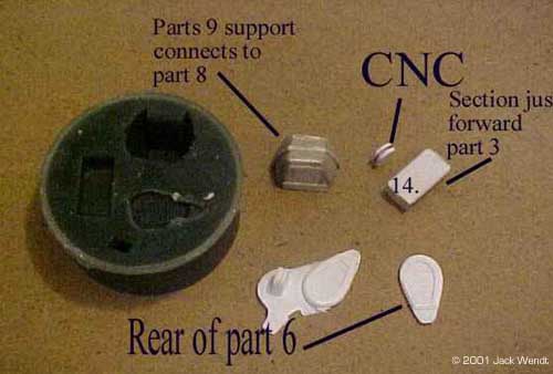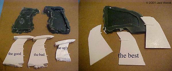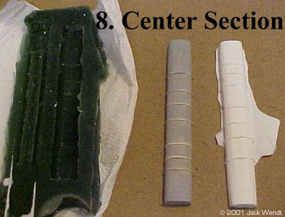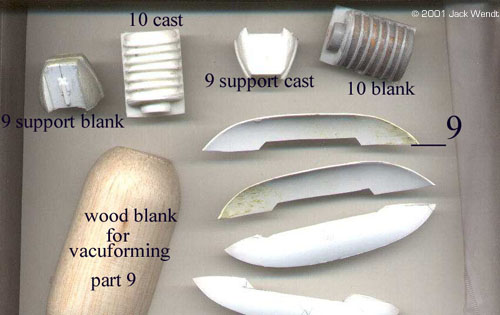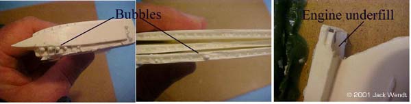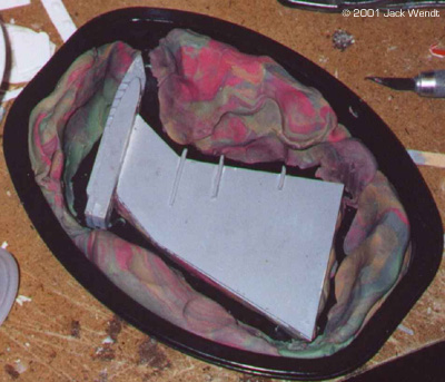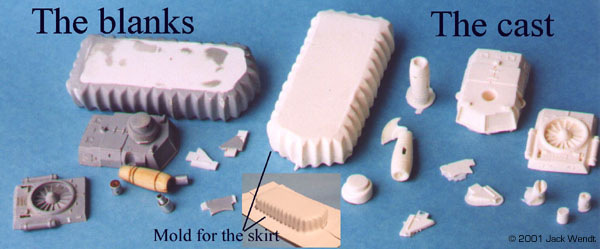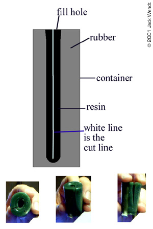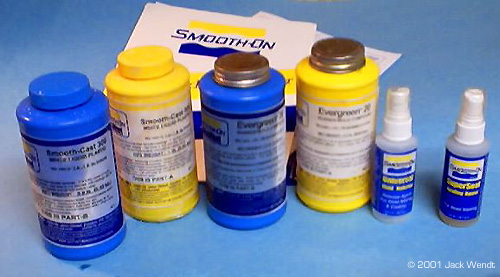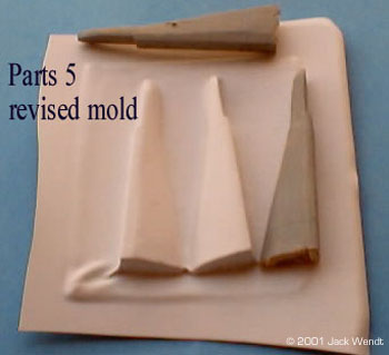 Of course, you would generally think of the only mold being made of the rubber, but other things can be used. All resins and rubbers come in 2 parts, a part "A" and part "B" resin and the same for the rubber. Some resins and rubbers are measured by weight. Others are an equal mix of part A and part B. Equal mixed resins and rubber will be easier to use. There are at lest 2 vendors, Smooth-On and Ace Resin that have a starter kit that comes with equal amounts of resin and rubber, as well as a sealer spray and mold release spray. Smooth-On is the only one I have tried so far. Smooth-On has distributors in various states, and they send you a very complete guideline to getting started in this hobby. Ace has not updated their site in over 5 months (at the time this was written) so some of their information is incomplete. Synair Corporation, who develops Poly Cas,t does not list a starter kit. Once you have your resin, you need to acquire some measuring spoons and cups, as well as a digital timer. You do not want to "guestimate" proportions. The mixtures to properly cure must be equal 50/50 of part "A" and part "B." The mixing time must be strictly adhered to, so you need the accuracy of a digital timer. If the resin or rubber do not cure, it will remain tacky forever! You mix the two parts of your resin for at least 1.5 minutes. You then have 1.5 minutes to pour your resin. A couple of minutes later you should see a white film beginning to appear. While you are mixing the resin, you may feel heat generating in the bowl, if the bowl is thin enough to transfer the heat. Once the total of mixing time and pouring time has passed, you should be able to remove the cast in about 5-10 minutes. The urethane rubber is another story. If it is not mixed right, you just wasted your time and money. What to do the mixing in? You should start saving up some of those disposable microwave dishes as well as yogurt cups, sour cream/whipped butter canisters, and of course everyone's favorite: the trusty film canister. Actually you can mix in about anything; it is just whether you want to reuses the same mixing bowl again. The types of mixing bowls just listed are made of the same type of plastic that can only be bonded with epoxy glue. This means that once the resin or rubber has cured, the left over amount in the bowl can be easily removed, but do not throw the leftovers away. You can also use essentially any container that has a flat surface. The purpose of the flat surface is that on small lightweight blanks, you will need to anchor them to the bottom of the bowl with a drop of glue. If you do not anchor the blank, it may float up in the rubber before it is cured. The glue can be epoxy, white glue, or "CA" superglue. Unless you are doing an extremely big project, you do not have to wait to de-mold as required in the literature. According to the literature, the Evergreen mold will cure in about 15 hours. On all the parts related to this story, I never waited more than about 6 hours. So how do I know how much rubber or resin I need to measure out? Ah don't worry about it. If you follow the mixing instructions precisely, then you can add layers to your resin and rubber. Just remember to mix/stir for the entire time that is recommended. In addition, you can keep little blister packets, such as for medications, cosmetics, film canisters etc, for your left over resin. If you have a lathe than a few film canisters of left over resin can be turned to produce new blanks. For wood or plaster blanks, you will need to spray a sealer that is included in the starter kit, to fill the pours or the rubber will stick to every detail of the porous object and ruin the mold. For all blanks, a light coat of release is needed. Do not use too heavy of a coat of release or your cast will come out looking like an orange peel texture. The aerosol spray is easier to control than the little squirt bottle that comes with the starter kit. Orange peel is a term that refers to having sprayed in heavy coats of too much paint on a model resulting in a rough texture. This is perfect for a shadow ship, but not a '57 Chevy. Take a small brush and brush the release in to the crevices that the spray might miss.