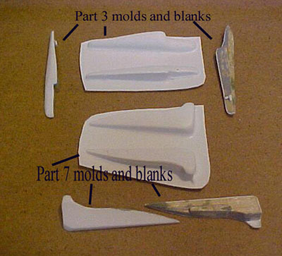 According to the manufacture, the rubber and resin once shipped should be used right away. The spokesman stated that although the bottles are sealed, oxygen and water vapor would eventually enter the sealed containers and ruin the product. Therefore, I suggested that you bag the bottles inside of one or two Zip lock bags. Store the casting material in the coolest, driest part of your house. Reseal the lids immediately after pouring out a measured amount. These tricks seem to work somewhat, as I have some resin and rubber that are about 6 months old, and I am in Texas. Now there are 2 types of molds: One sided and 2 sided. If a part can be produced in a one sided mold, then do it. It will be a lot easier, and there will be less cleanup. If it has to cast in a 2-part mold, be prepared for some flash cleanup. One part molds are more susceptible to the blank rising into the rubber. This is the reason for attaching the blank to the bowl with glue. ![]() When making a 2-part mold there are a few thing that needs to be done. First the blank has to have clay pushed around it so that the rubber will only cover approximately half of the blank. Second, you will need to put some locator pinholes with the end on a pencil or popsicle stick so that the 2 molds will align properly. You do this my making a few shallow gouges in the clay. Once one side of the rubber is dried, a coating of mold release or petroleum jelly is sprayed on the blank and the mold, otherwise the newly poured mold will bond with the previously poured rubber and blank. Rubber bands hold the 2 sides of you mold together when you are ready to pour your resin. For most things, there is an easier way to cast 2 sides with a one mold. Again, it is far easier thing to cast as one side then trying to cast something two sided. Look at this drawing and imagine a cigar. The end of the cigar is where you would light it will represent the hole in which the resin is poured. The end of the cigar is attached to the bottom of the bowl with glue or a screw if the item is light in weight. The cigar is stood on its end and rubber is poured all around the cigar from top to bottom. Once the rubber has cured, the rubber and the cigar are removed from the bowl. Take a new, sharp blade and cut down one side, a clean cut, touching the blank. Cut down the side at least 90% the way down to the opening where the rubber is poured. What we want to accomplish is to have a straight cut running down one side of the cigar, almost to the point where the cigar would go in your mouth. Doing this may result in a cut, or scratch to your blank, but you now will only have one seam with little or no flash. In this insert, you will see a model of a hover tank. The engines for this tank were cast as one piece. The only significant area of clean up is the spout, where the resin is poured. The mold for these engines is the picture inserts in this image. The bowl for these engines was a film canister. In such a cast as the one illustrated, cut the bottom off the film canister, and use it for keeping the molds shape and containing leakage. In the preceding paragraph, I showed a part cast in 2 part molds. Where the pour hole or spout is located, I could have anchored the same part to a bowl with a dab of glue. Then I would have poured the rubber around both sides of the blank, covering the top. Once the mold cured, I could have cut a slice along the backside that is covered up by one of the pieces. On to Building Excalibur Part 1 was made in layers and sanded to the right shape. The small fins on both sides of the top of the engines actually casted fairly well considering how small and thin they were - .015". Part 2 consisted of 2 layers of .040" thick plastic sheet, sandwiching a slightly smaller in diameter but thicker piece of .075". Then small strips of styrene were used to detail between the 2 .040 pieces. I tried casting part 2 as a 2-part mold. I then cast it as a one-part mold, and finally tried casting part 1 and part 2 as one piece. ![]() To be very honest, the part I needed the most, part 2, was the hardest to cast. If I were to do this model again, I would cast the engine as two one-sided pieces, or a one-piece cast as described using the cigar example. The problem with the wings, part 2, was the indented area always trapped air, making it hard to fill consistently with resin. To do something like this, I would suggest leaving off one of the .040 ends, and casting the rest, then use sheet plastic to attach the other .040 side. Removing part 2 from either a 2-sided mold or a single sided mold can lead to warping. This is a common complaint from model builders who buy resin kits. The warping comes generally from thin/long/wide pieces. This is also seen in the above picture. In my case, a heavy weight will reconfigure the wing. Hot or warm water or a hairdryer is suitable for reshaping most resin pieces that have been warped in the mold making or shipping process. Earlier I showed you a picture of the hover tank. The entire skirt blank was vacuformed and used to hold the resin. As long as there is minimal detail, you can cut corners as far as cost in the mold department. With something like the skirt of the tank, I made 2 cuts on the tip of the skirt at both ends. Scotch tape held the area closed until the resin hardened. After the tape was removed the mold was flexed, and the cast popped out. Minimum flash was found at the 2 cut areas. I also vacuformed a box that was put inside the skirt so as not to use as much resin. Remember a sheet of styrene .040 thick, 4'x'8' in size, is only about $15. ![]() Part 10 exists in 2 places but are of different sizes. Part 8 is the long thin section that runs the length of the ship. These were cast as single sided molds. Part 12, which consist of the tubing that runs under part 8, was scratch built, and cast as a one-sided mold. I used .015 for the little fins that separate the tubes in part number 12. Due to the fins being so small, t