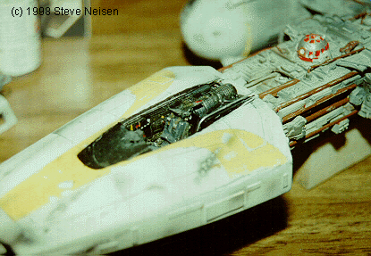 STEP 6 DETAILING THE EXTERIOR AND COCKPIT. This will probably take you the longest time to complete. Get out your spares box and junk kits because it's kit-bashing time. First make sure your Y-Wing has clean edges. Give it a quick coat of primer to show imperfections, then fill and sand as needed. |