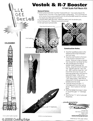 What You Get What you get inside Cutting Edge Modelwork's signiture robust black box is the first really accurate kit of the Soviet R-7 booster in the configuration used with Gagarin's Vostok spacecraft. Apex/AER and Airfix made plastic kits, which show their age (Airfix) or low-pressure injection, limited run production (Apex/AER). Both require significant work to accurately depict the Vostok 1 launch. Forty-four or so grey polyurethane resin parts in two bags, plus instructions, make up the kit. Mastered by NASA patternmaker Ben Guenther, the parts are crisply detailed and almost perfectly cast. Cutting Edge are predominantly a manufacturer of aftermarket accessories for model aircraft, and have a well-deserved reputation for high quality products. That pedigree is evident in this kit; I had to look long and hard to find any flaws at all. There was one small gouge on one part; on that same part (the lower part of the second stage) several of the tiny raised panels ringing the bottom of the cylinder are slightly skewed. Unless you get really, really close up, you won't notice either. My review sample also had an odd grey pattern along one side of the central booster. The area has no different surface texture than the surrounding areas, nor is it sticky (as if uncured), or raised or lowered in relation to its surroundings. Prominent though it seems, it should disappear under a coat of primer. Instructions are typical of Cutting Edge. Pictures and concise text walk the builder through assembly in a logical fashion. The only thing missing is a paint guide (which should be generally similar to the earlier Sputnik configuration). Assembly and Finish Assembly will require some care and patience. The lattice-like bracing that holds the strap-on boosters in place are provided as single lengths of very thin resin, which will be a challenge to cut from the casting blocks. Likewise, the triangular bracing that holds the second stage is very thin, and will require careful trimming of the flash between the struts. Otherwise, removing the casting/pour stubs from the parts should be a relatively simple matter with razor saw and sandpaper. Conclusions This a fine little kit that should appeal to fans of the early space programs. Due to the fineness of some of the parts, I'd recommend it to modelers with some experience working with small and fragile parts - and who have steady hands. If you've successfully used aftermarket detail sets for smaller (1/48 - 1/72 scale) aircraft, you should have no problems with this kit. Many thanks to Meteor Productions for providing the review sample. Manufacturers and retailers, interested in getting your wares reviewed and publicized on a site averaging 3000+ readers a day? Contact us! |