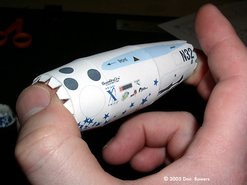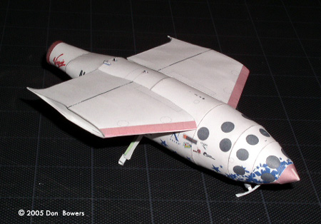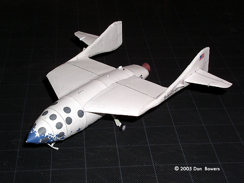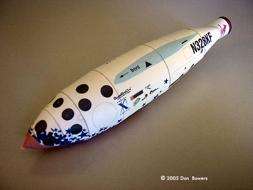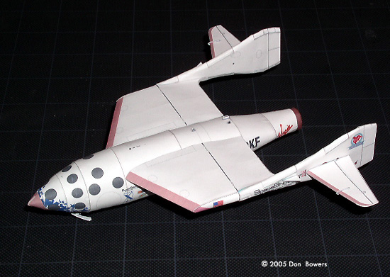 Other than those two little quibbles, the rest of this model was a joy to assemble. The design of the parts for the fuselage make for a very rigid body capable of withstanding some rough handling (zooming around the room; don’t lie, I know you do it too!). The main wings are built with three internal paper “ribs” to help keep the airfoil shape and make them rigid, and these attach to the fuselage by sliding onto two spars that run through the fuselage body. Surprisingly, they line up perfectly with very little effort and matched the contours of the fuselage without any trimming. Even the twin tail booms, which are by far the most complicated parts to assemble (each one is made of seven parts), went together in less than two hours each. Another version of the model is available, which sports M&M, 7-Up, and Virgin Galactic logos and coloring. This one also has the elongated engine shroud that housed the enlarged thrust nozzle. Conclusions On the whole, I would highly recommend these models to anyone with interest in the subject matter. I’m not a very experienced paper modeler and I found these to be challenging but enjoyable models to put together. Matter of fact, I almost felt guilty using my X-Acto blade to trim the parts free from the paper. Seriously, you just want to sit there and stare at the parts sheets because they were done so well! |