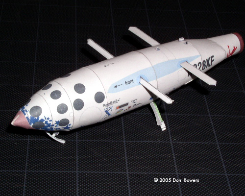 On October 4th of 2004, a small spacecraft ignited its rocket engine and launched itself into history as the first privately funded venture to put a man in space, thus winning the ten million dollar “X-Prize”. Ralph Currell however, was a bit ahead of the game. He had a 1/48 scale paper model of SpaceShipOne available months in advance of this moment, and it’s a wonderful little kit. With the appropriate card stock, a good printer, and some patience, you’ll have great results. The prints are gorgeous, the instructions surpass most of those provided by injection-molded kits, and the thought and design behind the model makes this one a joy to assemble. What You Get First, just taking a look at the three pages of parts is enough to make one appreciate this kit. The detail is crisp and clear, down to the individual rivets and screws that hold the body segments together. There are smaller instructions printed directly on the parts sheets indicating where to make smaller cuts that are important to later steps, as well as a number of markings that help in properly lining up the sub-assemblies. The instructions comprise five pages of crystal clear detail. The first two pages give a history of SpaceshipOne, as well as details and tips on what tools are needed, along with step-by-step construction information. The last three pages contain clear images detailing the twenty-two assembly steps. And unlike many of the injection molded kit instructions we tend to ignore, these are laid out in a logical order that I found no need to stray from. With all of this card-modeling goodness, there had to be a few drawbacks. I’ve got to admit that I’m nit picking with these, but here they are: 1. Step 9, part numbers B21 and B22 – This one takes some careful assembly and bending in order to get it to fit the fuselage perfectly. It’s not impossible, but does test the patience. 2. Step 19, part numbers A23, A24, A25, & A26 – These can be difficult only because of the small size of the parts. The largest one measures just under 5mm, and the smallest ones are about 1mm square. The small size makes them awkward to place perfectly but they do add a lot of character to the model. |