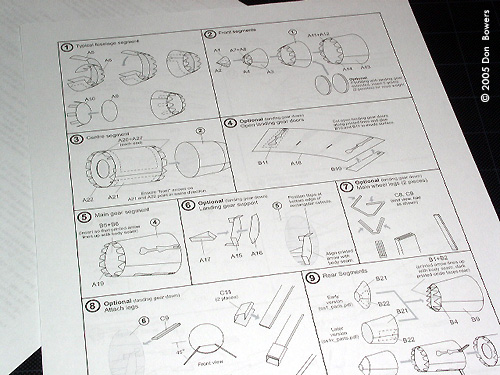 ^ Starting point Image: Instructions are clear and comprehensive Image: Subassemblies ^ Coming together Image: Fuselage? Hull? Whatever, it's built Image: Adding wing spars and landing gear doors Image: Closer look Image: Wings attached ^ Nearly complete Image: Rear view |