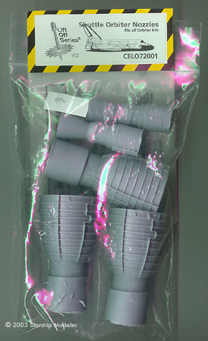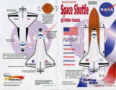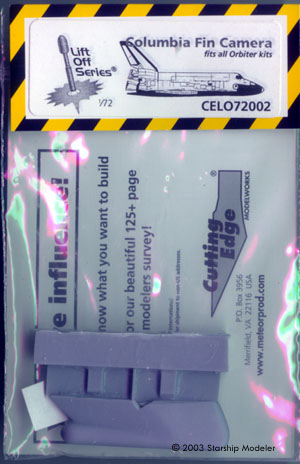 Orbiter Tile Decals In years past, modelers replicated the distinct thermal tile patterns on the orbiter by scribing, small squares of tape, and intricate masking. Thankfully, only the most masochistic need to resort to those lengths anymore. Cutting Edge's decals provide all the black and white thermal tiles, top and bottom. A simple, clear placement guide is provided to help you get the correct decals in their appropriate spots. Extra decals are provided, both as simple extras and for the landing gear doors in the open position. This comes very much in handy when building kits other than the suggested ones, as you have extra material with which to fill in any gaps. Cutting Edge suggest that you find a big bowl in which to dip the entire marking (ie, the wing halves) but folks I've talked to had no problems cutting the individual markings into smaller, more manageable chunks and then applying. There are two principle compalints against these decals: Resin Replacement sets No orbiter kit has decent engine bells. Both RealSpace and Cutting Edge supply replacements for the three main bells amnd the two smaller ones. Both are far superior to kit plastic, regardless of kit. The Cutting Edge pieces are cast in their standard tough, smooth grey resin, while RealSpace's are cast in a softer white resin. It's exceedingly difficult to discern any difference between the two, outside of the size and shape of the pour stubs. On closer examination, the RealSpace set have very fine extra detailing along the exterior piping. This may or may not disappear under a coat of paint. Cutting Edge also supply Columbia's fin tip camera pod in two scales. Both are perfectly cast in their trademark hard grey resin. If you want to do Columbia later in her life, you'll need the appropriate set. Conclusions All the available Shuttle kits need help in varying degrees. If you want something that looks more like a scale reproduction and less like a toy, you'll want aftermarket detail products. Cutting Edge's products offer a quick and accurate (depending on your degree of obsession with colors) way to achieve a good Shuttle model, in 1/72 and 1/144. Having used other products in their decal, Black Magic and resin upgrade lines I can say their products are first rate - good quality and relatively easy to use. More ... particular ... modelers will probably want to combine the Cutting Edge products with RealSpace and New Ware releases. Regardless, you'll need good references. I suggest: