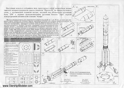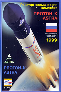 The Proton booster has served as the primary heavy-lift launch vehicle for Soviet, and now Russian, unmanned space systems since the mid-1960s. It's the largest Russian launch vehicle in operational service and is used to launch Ruissian military and scientific payloads, as well as commercial payloads for companies around the world. As a three-stage vehicle it can launch large space station-type payloads into low earth orbit, and in the four-stage configuration it can launch spacecraft into high energy (geosynchronous transfer, geosynchronous, and interplanetary) trajectories. The latest variant, the Proton-K/Block-DM, is capable of placing approximately 19,760 kg (46,000 lb) into low earth orbit (LEO). The first Proton test launch of the original two-stage "D" (SL-9) model took place in July 1965. The two-stage D version has been superseded by the three stage D-1 (SL-13) model and the four stage D-1-e (SL-12) model, both of which are still in use. As of September 2000, over 225 Proton vehicles have been launched. The first western commercial mission, the Astra-1F stellite, was successfully launched on April 9, 1996. What You Get Following their first releases (four Soviet space shuttle kits in 1/288), Russian model company Start has turned it's attention to the Proton-K satellite launching rockets. There are three versions available: Zarya (the first Russian module for the International Space Station); Astra, and Mir. All are identical, except for the payload section, which comes as two pieces on a separate sprue. The bulk of the kits are molded on a single sprue of white plastic. There are about 40 parts, including a small base. There is a lot of flash present, though most of it appears to be on the sprue runners, rather than on the parts. Detailing is minimal, but that's expected for a kit in this scale. What little there is looks crisp enough. There are no ejector pin marks or other blemishes to mar the outsides of the parts. Instructions come on one sheet of paper, with what I assume is a history on one side, and parts list/assembly guide on the other. All the writing is in Russian, but fortunately the assembly steps are clearly layed out in 8 diagrams. Unless you read Russian, you'll have to look elsewhere for painting and marking info. The boxtop looks accurate enough to use as a guide, based on the photos I've seen of the real vehicle. One small sheet of waterslip decals is provided, containing markings for all three kits. Registration is a little off, but not so much as to make the markings unusable (not like Heller's awful Ariane decals!). They appear thick enough that one should have little problem using them, but I'd be careful using setting solutions/solvents on them. Assembly & FinishAssembly should be pretty simple. From what I've heard about Start's earlier kits, however, you'll need that putty and some fresh sanding sticks. |