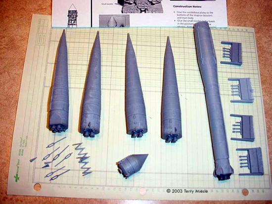Cutting Edge was thoughtful enough to include one spare set of these last pieces, as potential for damaging these straps is quite high. At 1/144 scale, this kit stands about 8½ inches (22cm) tall. Cutting Edge uses a strong grey resin which is quite resistant to breaking and very easy to work with. They have a great reputation for well-cast products. However, I found bits of mold rubber in a couple places on my kit, and a glob of resin on the main booster, apparantly from mold breakage. I have no doubt the molds would soon be replaced. Closer inspection revealed that the four "strap-on" boosters in my particilar kit were not the same size - two were noticibly shorter (almost 2mm), and don't quite reach the mounting points on the central booster body.. I'm not sure if that's the way it's supposed or be or not, but other modelers with examples of this kit report having 4 identical boosters, so I'm guessing someone goofed when packing. Removing the pourstubs from the boosters will be tricky, the instructions do mention the need for care not to damage the secondary booster fins. I wasn't careful enough, and tore two of these fins off. The instructions are probably the weakest part of this kit. It's a series of notes rather than a specific set of instructions, but a set of pictures do go a long way toward making up for this deficiency. No color references are provided. There is a great deal of ambiguity regarding the colors, and I'm still researching these. Apparently the Luna rockets were all gray, the ever-attractive battleship grey or something slightly lighter. The Vostok had some white on the payload section, and other vehicles apparantly were all white. No decals were provided, so you're on your own to determine if any markings would have been visible. Conclusions I'm impressed (as usual) with Cutting Edge's casting, and this looks to be an easy assembly. It's not cheap, but I think $50 is a fair price considering the fine casting and the fine details of the small parts. Many thanks to Terry's wallet for providing the review sample. Manufacturers and retailers, interested in getting your wares reviewed and publicized on a site averaging 3500+ readers a day? Contact us! |