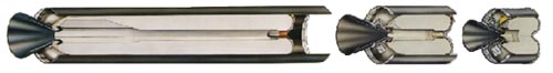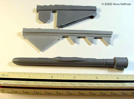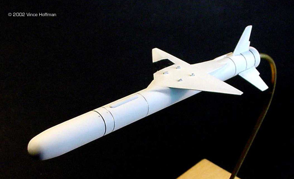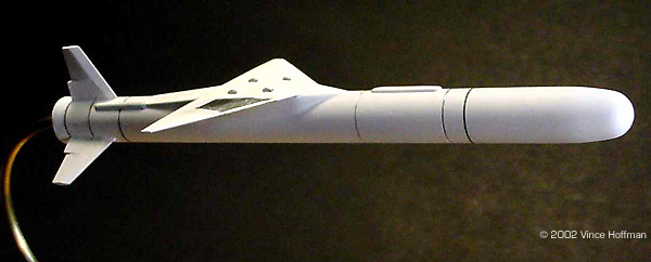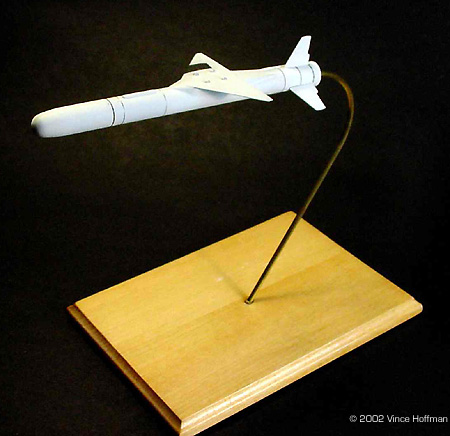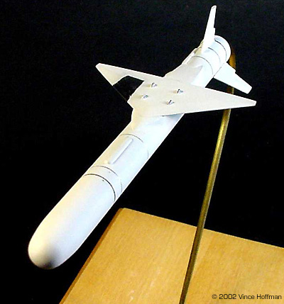 The Pegasus launch vehicle consists of three solid rocket motor stages. A wing and fins provide lift and attitude control of the first stage, and gimbaled rocket nozzles on the second and third stages. The vehicle is carried aloft horizontally and dropped from a carrier aircraft at approximately 40,000 ft and .8 Mach. Upon motor ignition, the vehicle accelerates to a velocity of 8,300 fps (8.3 Mach) and performs a 2.5 g positive pull up to the correct trajectory angle. The 2nd and 3rd stages are then fired sequentially to place the payload into orbit. The KitThe kit, produced by Cutting Edge Modelworks, consists of 7 very nicely cast resin parts and a single page instruction sheet. No decals are provided. The kit costs $17.99 from Meteor Productions. Accuracy is quite good, although some panel lines were omitted from the forward parts of the rocket, and there is no engine detail. The wing shape is good as is the wing boot. The only problem I found with the kit are the tail fins. They all appear to have been carved individually and none exactly match the others. Moreover, the surface texture of the fins is a bit rough. All of the parts are still attached to their pour lugs, which with the aid of a razor saw, are easy to remove. Construction Assembly was fairly straightforward. The parts were removed from the pour lugs and sanded. The rough textures on the tail fins were sanded, and some fine cuts with the x-acto brought each fin closer in appearance to each other. I drilled out the engine with a countersink bit, then used a 1/8" bit to make the hole for the mounting wire. The fuselage was then temporarily glued to a wood dowel to make construction and painting easier. The wing was attached to the fuselage with superglue. The lower surface of the wing fits very nicely to the wing boot, but the top of the wing requires putty to get all of the angles to conform properly. Bondo glazing putty was used for this to very good effect. After the wing putty had dried, the tail fin locations were measured and marked with a pencil. Then the tail fins were securely glued in place. Painting & Display The model was painted in flat white Gunze Sangyo acrylic paint. An airbrush was used to apply the paint in three light coats, with the final coat being "wet" with 60% isopropyl alcohol. This final wet coat creates a very smooth surface finish, as opposed to the grainy appearance flat paints tend to leave. The only surface detailing are finely scribed lines around the circumference at each stage or connector section. These were drawn with a .003 black pen, with two of the rings hand painted with chrome silver. Bare Metal Foil was used for the silver panel on top of the wing. Conclusion I spent a total of 12 hours building and painting this kit, with most of the time going into carefully puttying the wing boot and painting the model. I am very satisfied with this kit overall, but it would be nice to have some decals. My local hobby shop did not have an L-1011 kit in stock, so a test fit of the pylon was not possible. The rocket fits quite nicely into the pylon and I don't imagine the modeler will have any trouble with attaching it to the aircraft. |