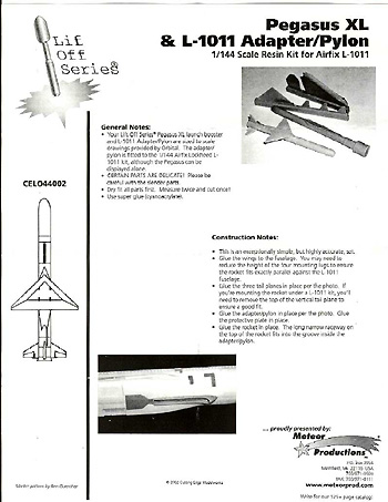 Image: More putty was needed on the underside of the wing root Image: Instructions are adequate Image: "Maggie", pre-launch Image: Test vehicle, mounted here on a B-52 Image: Carried aloft by a modified L-1011 Image: Another in-flight view Image: Aloft, right side Image: On the pylon Image: On a ground-handling trolley Image: Motors |