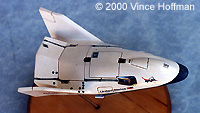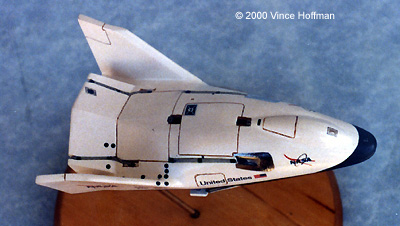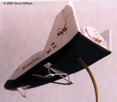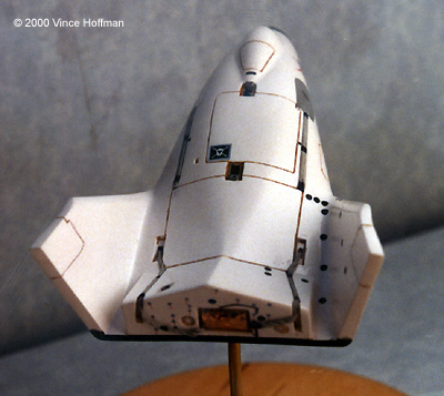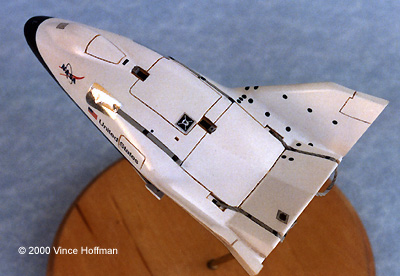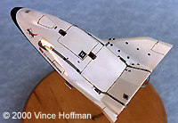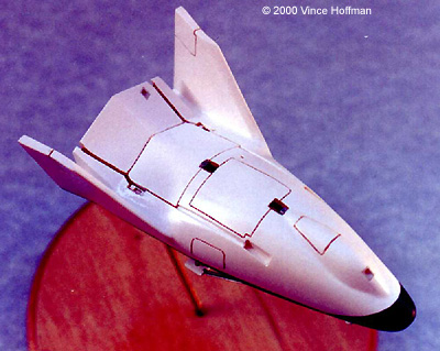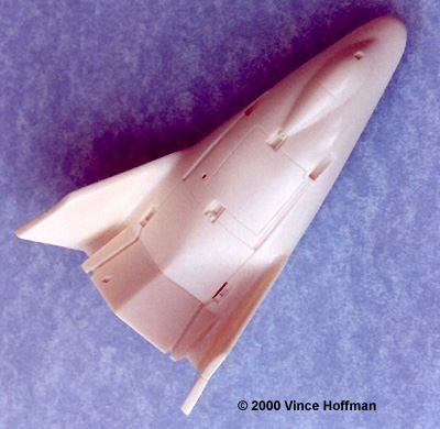 The Kit The kit, produced by Muroc Models, is very accurate with clean, crisp castings which are completely devoid of air bubbles, mis-aligned molds and other common resin casting faux pas. The decal sheet included with the kit represent V131, the first flying test vehicle. The kit contains one wire, 2 plastic and 9 cast resin parts, most of which make up the complicated landing skid assemblies. The parachute risers and foreward riser attachment farings must be provided by the modeler. A full color 3-view painting and decal guide accompanies the single page text-only instructions. The kit cost $23.00 including shipping (the price has risen due to shipping costs, as of 3/1/2001) and I received it within a week of placing my order. ConstructionI decided from the beginning I wanted to display the model with the landing skids extended - with all of the beautiful castings, I could not let them go to waste. After carefully cleaning the parts and straightening the two slightly warped main gear struts, all of the parts were washed to remove casting residue. The model has very finely scribed panel lines around the control surfaces and various hatches. With such care put into sculpting the master, I was quite displeased to find the two hatches on either side of the cabin to be rather crude scratches, requiring a lot of very careful re-scribing with a sharp dental pick. Being just about the only flaw I found in the kit, I was content with taking the time to fix the hatches. With everything now cleaned, all of the parts, including the inside of the gear bays, were painted with several light coats of gloss white and left to dry. After one day, the gear struts and skids were temporarily tack glued into the fuselage in the closed position. With this minor bit of assembly out of the way, the fuselage was ready for black paint. The black areas were masked off with low-tack tape and painted. Minor touch-ups to the black were required around the trailing edges. After the black paint dried, the landing gear struts and skids were removed and the aluminum parts of the gear painted and set aside to dry. At this point, the drogue chute was covered in bronze mylar and glued in place. With the gear parts cut to fit and painted, everything was now assembled in place. Great care must be taken to place the main skids at the correct angle, the box top photos are (unfortunately) the only reference material I could find which shows the gear extended. Because the landing skids are so delicate, the model was now permanently attached to a wood display base. Final Painting and Decals The model was evenly sprayed with clear acrylic gloss and set to dry for several days. To accent the panel lines, artist oil "burnt umber" was thinned with airbrush thinner and applied to all panel lines and the mortar caps in the back. When the wash had several days to dry completely, a paper towel dampened with thinner was used to wipe away the excess wash, leaving behind very thin lines. The parafoil door latches, camera recesses, mortar caps and tan fiberglass areas were now painted according to the instructions and my reference material. |