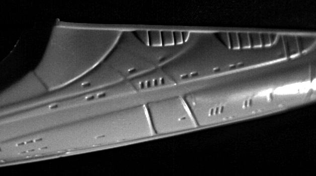 The nacelle pylons go straight from the engineering hull to the engines. They should leave the hull at a very shallow angle (if not flat) almost up to the flush vents or whatever they are, then angle up to the engines. This is a bit tricky to correct. The starboard (right) nacelle pylon is obviously thicker at the root (hull joint) than the port pylon. It can be filed to proper thickness if you don't do the angle correction above. The shape of the navigation deflector tunnel where it meets the dish is a bit off; it should be a bit flat at the top but is round in the kit. There is some pronounced "channel" detail which either shouldn't be there or is grossly out-of-scale. |