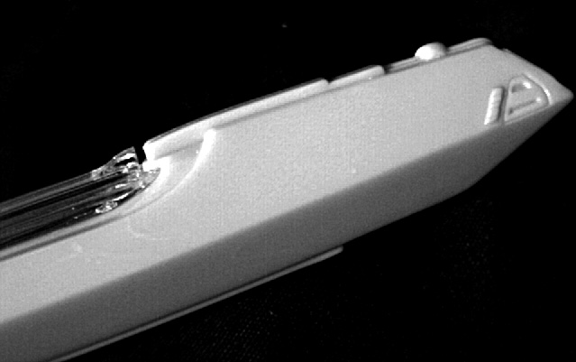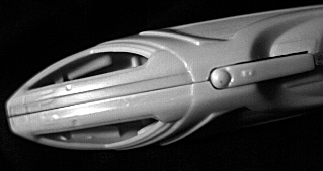 Engineering hull has left/right halves, plus insert panels for the navigation deflector "tunnel" and torpedo launcher blister, and the aft shuttlebay cove (underside). A U-shaped part which is essentially the fairing between the top of the enginneering hull and the rear of the saucer at the shuttlebay attaches to the top of the hull assembly. Small parts include the clear deflector dish, a small belly detail panel with phaser strip (a sloppy fit), the stand mounting point, the aft shuttlebay doors and a small part at the aft belly which I can't identify. The saucer and engineering hull mate almost exactly as they would per production sketches depicting separation...you can, with just a few modifications, do a saucer-separation display! Engine pylons are top/bottom split, with large rectangular mouting "pads" fitting to the engine nacelle undersides. The pads should line up with corresponding raised panels on the engine undersides, but a mismatch of just under a millimeter is enough to be noticeable. The pylons have large mounting tabs which insert into slots on the sides of the engineering hull. The tabs needed to be filed down a little to allow full insertion. Engines are left-right halves with 2 clear bussard collectors mounted from the inside and clear top grille. The area under the grille is solid and would have to be removed for lighting. There is a rectangular part which sits just ahead of the grille which inserts into a 20mm x 4mm slot; it's a sloppy fit requiring putty in an awkward location. The aft end of the engine is capped off with a small insert part. Errors and ommissions: |