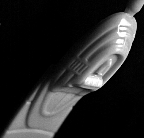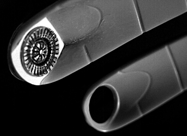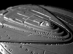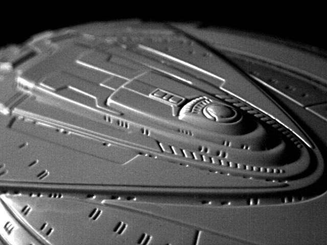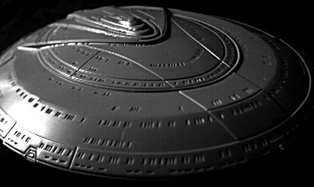 The saucer is top and bottom halves, with the bottom fitting into the top as with the Voyager kit. Two clear impulse engine grilles mount from the inside, along with the clear curved shuttlebay door panel. The shuttlebay observation area is a small tack-on part. There are three small (2mm) "cups", representing docking ports, which are mounted aft of the bridge. |