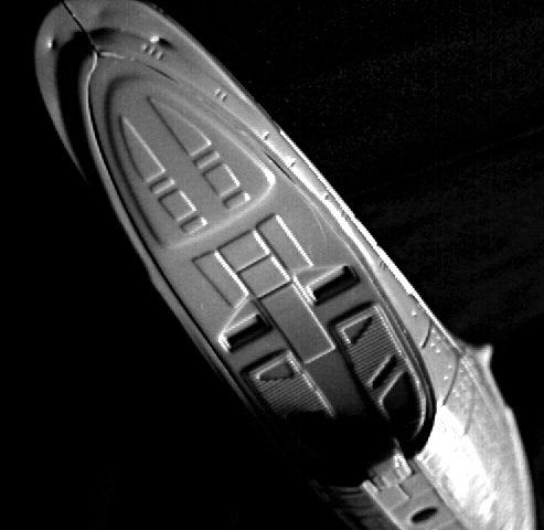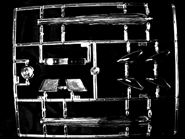 The finished model is 19.25" long, 7" wide across the saucer, and is in-scale with ERTL's Enterprise "D". My test shots show light gray styrene, with a clear parts tree containing the 2 warp nacelle top grilles, 4 bussard collectors, the deflector dish, 2 saucer section impulse engine grilles and saucer-section shuttlebay door panel. |
