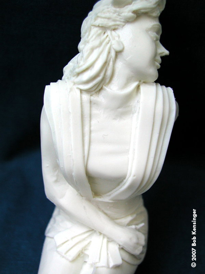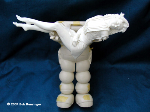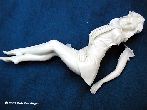 Well, this time you have Altaira, Morbius's daughter (played by Anne Francis). Not exactly the girl on the poster, but hey, we got us a girl! What You Get The kit consists of 2 resin pieces: Altaira's body and one arm. I actually would have preferred to have a few more parts to break up the cast a bit since the seam line does run through some details such as the hair. For some modelers this could be a tad more difficult cleaning up and recreating the hair details sanded away. Overall, not too bad, but most figure models come in more parts. NOTE: Not to slip into prude mode, but I would rate this kit as PG-13 mainly for the very well sculpted tight underwear peeking out (not the underwear itself, but the anatomically correct, er, snugness). This may be something to note if you don't care for that much detail or have an environment where it may not be appropriate. It's easily fixed or overlooked, but I felt it should be mentioned as this may bother some people. Assembly Attach her arm to her shoulder and that's about it. General clean up and seam filling. No instructions needed, but there is a small sheet included with generic tips on working with resin (as well as photo etch, pewter and vacuum formed parts...I did say it was generic). Accuracy Well, for the poster, it's not the same girl and therefore not at all accurate. Gave it a 5 for being female. As far as Altaira being the girl in Robby's arms, again, not accurate. The big HOWEVER is that it does represent a character from the film and as far as that goes, she looks fantastic. I've seen finished examples that are just beyond gorgeous. |