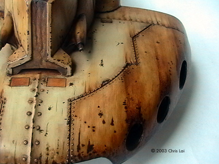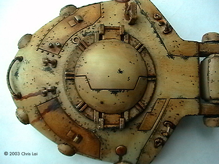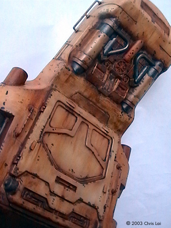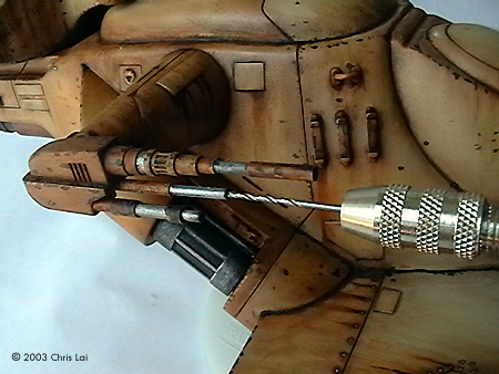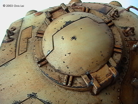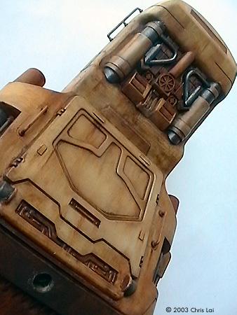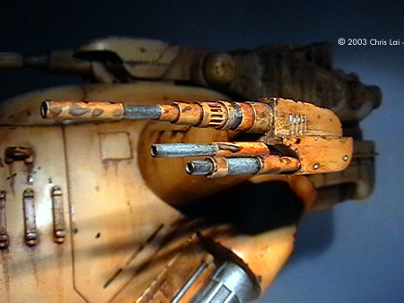 The twin anti-personnel and range-finding lasers are one slice of heaven on which you could experiment with a close tonal range of colors. You do need to delicately sand and file the seams on these lasers. They can haunt you sticking out unevenly after you paint. It is best to push the assembly onto the rotating pin of the tank. No gluing around either side of the pivoting point. That would allow you to rotate them 360 degrees as you paint the many corners without having to hold them in mid-air at the tip of your fingers. While putting on the colors, I used small pieces of tape to carefully segregate the silver/metallic from the range of Sienna, Umber and Sand. To add some realism to it, I used a small drill bit chucked in a pinvise to create an opening for each of the lasers. Perhaps then it will actually find something to shoot at. The exit ramp at the main hatchway was another delightful area to work on. Apart from the turret, this had to be my other favorite. If you imagine the scale of the chamber inside with sufficient room for at least four Battle Droids, this would not be a small exit. I have done some similar chipping here, always asking myself which are the areas that should suggest frequent contact with other surfaces, the material that its made from, the coat of paints revealed underneath those on the surface, and especially if it's likely to require weathering. The pictures here give you an idea of the choices I made at the time. I have decided to leave the 2 metal antennas out of the model since they did not beat the giant elephant ear design of my faithful ancient TV antenna. Perhaps the most challenging effect to create for me was the grey dust coming off the six launch tubes. I tried grey pastel chalk and black acrylic, both of which I could not gain sufficient control over the texture and its intensity. It just did not feel right for a while. Finally I decided to experiment with a short flat brush, not too soft and with some concentrated Raw Umber oil paint. I kept the brush fairly dry, the strokes short and not trying to apply all at the same time. It is still not what I had in mind. Maybe when I have built more models I will have this figured out. Some Final Words A fantastic kit with plenty of room for your imagination. A true joy to build and bliss to paint. I spent a total of approximately 36 hours over 3 months putting this together. Thanks Bernard in particular, has helped me tremendously. Thank you for looking over my shoulder and your invaluable advise. Stephen (MSFM), thanks for being there even if it is half a globe away. I truely admire your professionalism and enormous encouragement. Ian (MSFM), thank you for your timeless inspiration. My learning journey in modeling has just begun. References: