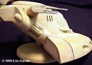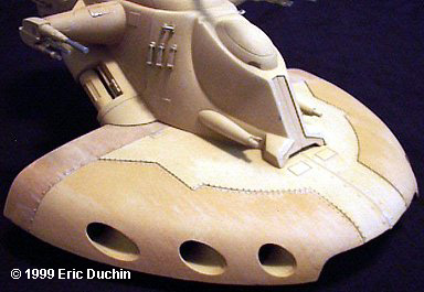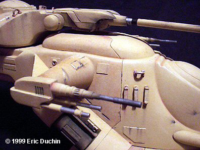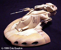 The Phantom Menace gave us not only the first chapter of the Star Wars saga, but a whole new range of model kits to enjoy. Among these is the Trade Federation AAT (Armored Assault Tank). This is a great looking vehicle. A big hovering hunk of armor, bristling with weapons. I picked up the model the first time I saw it at a local store, and couldn't wait to get started on it. When I opened the box, the first thing that struck me was how big the kit is. When it's all done, the tank is over 13" long. On the box the scale is given as 1/32. To give an idea of the size, that's almost exactly the same length as MPC/ERTL's X-Wing. Instructions are typical for ERTL. Big exploded view type diagrams, with all the part #s indicated, and a big paint chart on the reverse. With a little over 50 parts to this model, basic construction was fairly simple. The only disparity I found was on Step 3 of the instruction sheet. There are 2 parts labeled #42, when they should be parts #19. Just a typo I'm sure. . . not some evil ERTL gnomes trying to sabotage your modeling experience. Another thing I noticed about this model was that the locator pins between pieces look much larger than usual for ERTL. I haven't built any of their other newer kits, so I don't know if this is a trend or not, but it makes lining the pieces up very easy. The beefier pins almost hold the parts together by themselves. Also, the sprue attach points are rather large on some pieces, but by carefully removing the parts with an X-acto blade, only minor sanding was required to smooth these areas. After putting together each section of the model, the only real work I had to do was to take some time to sand the seams between some pieces. I didn't use any filler at all on my kit. When I sprayed on a coat of primer, most of the smoothed out seams virtually disappeared. A final note on construction: during Step 5, the instructions show you how the flat "base" section of the tank body is assembled. The main body then fits into 2 long slots on the top of this base. I would recommend attaching the main body to part #1 before attaching the flat bottom piece (#2). There was some minor warpage to part #1, and if I had put 1 and 2 together first, it would have been harder to get the main body to attach correctly. I left the turret and side guns off to make painting easier, but these parts are made to be movable, so after I was done all I had to do was snap them into place. As far as painting goes, I began by priming the whole model with gray primer. After that I kind of disregarded the color formulas provided on the sheet..... 80% of this and 20% of that. I just mixed a color I thought looked good. The box art on this kit was terrific, and I used the picture on the box top as one of my main references. I mostly use acrylics when I paint my models, and I mixed a pale yellow, using Citadel "Bubonic Brown" as a base, then lightening it with some off white. This was airbrushed on the whole vehicle. I didn't worry about getting a perfectly even finish, as this is supposed to be a weather-beaten looking war machine. After the base coat was dry, I used my base color and darkened it slightly with a medium brown color. I did use the paint diagram at this point, to see what areas should receive this contrasting color. I masked these off and painted them as well. On the chart, there are some areas with an even darker shade, so I added some more brown to my mixture and then hit these sections. What you wind up with is a tank done in 3 slightly different shades of yellow/tan. Following the box art and paint chart, I did some detail painting with silver. The tips of the guns, certain sections of their barrels, etc. I also drybrushed some silver on some of the joints between hull panels, simulating wear, and on the leading edges of the tank's base. I continued using the chart as a guide to paint areas that were supposed to be flat black. When all the paint was dry, I started on some serious weathering. When I weather my models, I use pastel chalks almost exclusively. They're great for getting that "streaked" effect, and applying them with a brush gives me more control than by using an airbrush. By varying the amount of pastel dust you use, and the amount of pressure you put on the brush, you can alter the effect tremendously. This method takes some practice, and believe me, once the pastel is on the model. . . man, it's there to stay. So if you use pastels, PRACTICE! Using pastels, I was able to simulate everything from the scorched look of the guns, to the oil-stained sections of the hull, to the small blaster hits on the tank. |