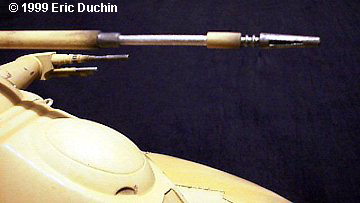 Another thing to keep in mind with this method is that after you apply the pastels, you HAVE TO use some kind of sealer on the model. If you handle the model and touch the pastels, they'll show fingerprints very easily. I used Testors Dullcote over the whole model to protect everything. To finish up, I used a tiny drill bit to deepen the holes in the turret where the antennae go. ERTL supplies these 2 pieces as lengths of thin metal wire. I just stuck them into the holes and the model was finished. As far as the round display base goes, I spray painted it black and placed the model onto it. There is some raised lettering on the base, but it is positioned far under the model, so I didn't go the extra step to paint it. I may go back sometime to do this when I get some of my other projects under control. |
