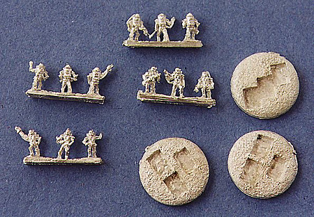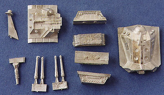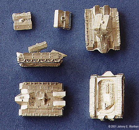 The OGRE model occupies 2 hexes demonstrating how out of proportion the figures are to the map. The main body takes up a whole hex grid and the caboose takes another. This problem is discussed in the rule book which states that for play purposes, the OGRE is said to occupy only the front hexagon. From previous experience, I know that this may become a problem during play. Some Assembly Required The heavy tanks need only their turrets glued on (or not, as the rule book suggests). The missile tanks just need their batteries attached. This is standard for the industry, but the GEV's require a bit more work. Each has a sprue of three tiny parts which need to be fitted onto the bug shaped vehicle: a tiny turret and 2 fins - for the 1960 cadillac look. The OGRE model has a total of 12 pieces: A main body, a caboose, 4 treads, 4 secondary battery canons, 1 primary battery canon and a tall mast on top. These shouldn't pose any problem to assemble, but with 11 pieces it is the most complicated miniature model figure I have ever seen. Modifications I've never understood the train like OGRE model. The caboose houses only the missile launchers. I don't see why they couldn't be on the main body, but I didn't design the game. I suspect I'll scratch build the missiles onto the main body, call it an OGRE Mark III and a half and have a model which takes up only a single hex square on the map to aid game play. Miniature Modeling The vehicles themselves will attract the gamer more than the modeler. The OGRE is the only truly unusual design, though the insect-like GEV is cool. The heavy tanks, missile tanks, howitzer, command post and infantry are pretty standard modern-looking configurations and don't venture too far into science fiction designs. Conclusions If you're looking only for models to make, OGRE won't thrill you. Though $50 is a good price for 38 pewter figures you'd probably be happier if you pick fewer and more unique designs. Warehouse 23 is making the OGRE line and you can buy individual models through them. You can pick up a Mark V OGRE from there and go to town. If however, you're looking for a fun easy to learn and teach game which plays in under an hour and offers you a chance to model a bit, I would wholly recommend OGRE. It's a great war game to cut your teeth on. If you've been thinking of turning your modelling skills toward miniature wargaming start here. Relevant Web Sites