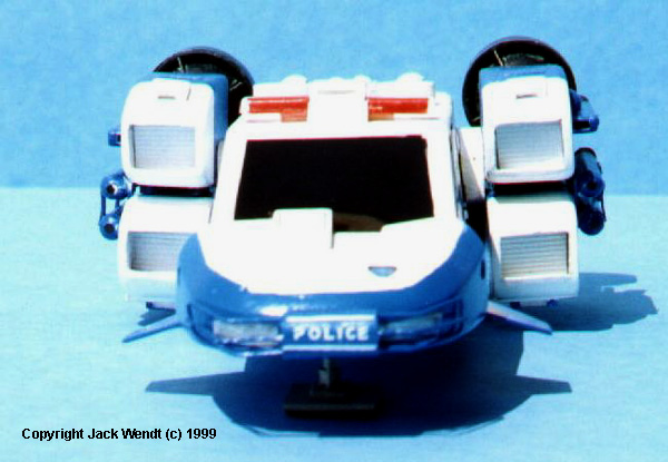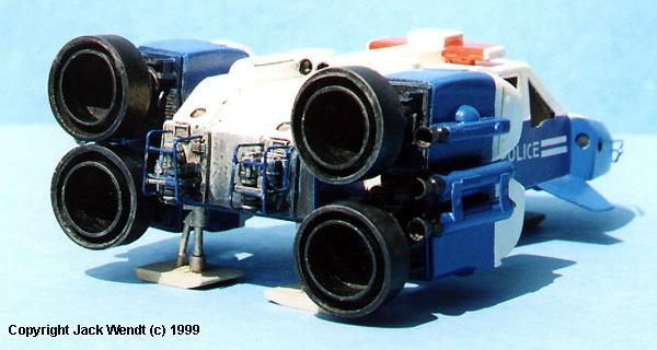"The name's Brogan, Lieutenant Brogan. For twenty years I was with the NYPD. Now - well let's just say I've transferred to another Precinct." This was a live action series from Gerry Anderson. It involved human police officers working with aliens on a rather large space station. Sound familiar? The Demeter City police cruiser was the main mode of transportation and it could function in space as well as in the atmosphere of a planet. I worked with only about 8 photographs of the cruiser. I got these entirely from people or web sites on the net. I first cut, and sanded a piece of pine for the main fuselage. I then vacuformed the plastic over the blank. It turned out that the car was too tall, and too long. The shape appeared right. I cut a section of the back and I cut the top off an lowered it. After priming, and sanding, I painted the front of the fuselage black. I then took .10 thick styrene sheet and cut out the windows and door handles on the side. I then glued these strips to both sides of the cruiser. This left the windows and door handles recessed. I used strip styrene for the frame of the front windshield. I then used scotch tape to mask the windshields and side windows. Getting the nose with it's complex curves required laminating several strips of thin styrene. I first took the strips and curled them around my Xacto™ knife this put less strain on the glue while drying, and made bending easier. I also had to use a lot of putty on the front of the vehicle. The 2 flat round objects that are to the rear of the vehicle, on top, are the silicate holders put in with some medications to absorb moisture. The 2 oblong rounded curved pieces at the back just forward of the engines are from a disposable dropper. Next, I proceeded to make the main 4 thrusters. After cutting out the shapes I laminated strips on the top and the bottom to get the right thickness, as before first curling the strips around my knife handle. The insert for the front intake of the 4 engines is sheet styrene that can be purchased. It is listed as corrugated, as in tin, for buildings that you see in connection with model trains. The smaller side thrusters that are attached to the main thrusters came next. I used tube styrene for the body. I took a round ink pen top, held it in a vice, and heated styrene over a candle. I held the styrene with hemostats (locking surgical clamps). I then pulled the heated styrene over the ink pen top. This gave me the shape of a small dome which is attached to the front and back of the tubes. For the small thruster cones, 6 of them on the side of the 4 main thrusters, and 2 in the center of the top, I used a similar technique in which I used a ball point pen. I have several that are plastic, but the very bottom, as where the ink cartridge/ball point protrudes, is metal. Using the same technique I heated a piece of plastic, pulled them over the tip of the pen, and used the metal part as a cutting line to cut around the circumference. The rear engines were made using wooden Easter eggs, available at hobby and craft stores. |