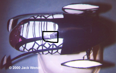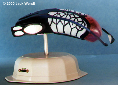 The next part was to make the covering for the cockpit. The dome on the Taelon Shuttle is actually an energy barrier. To duplicate this I first vacuformed 2 clear canopies, individually, over the Sculpey cast that I earlier made. Then I went shopping for some of this new colored Reynolds plastic wrap. There are several colors available and I wanted blue, but only found Crystal Purple. Purple actually works well depending on the light. I took the plastic wrap and wadded it up real tight, then un-wadded it, and sandwiched it between the 2 clear canopies that were vacuformed. The canopy was then attached to the ship using superglue. Leftovers from the top and bottom second layers of the front of the fuselage that were earlier vacuformed made up the outside midnight blue trim that encompasses most of the canopy of the ship. Two arms or extensions were then attached that hold the two gizmos that extend in front of the ship. I guess this has something to do with the energy barrier for the cockpit. I did not make the base, I bought it. It is simply a cheap microwaveable dish that was purchased for a dollar at a thrift store. A hole was drilled for the aluminum support tubing, and this hole was built up inside the dish with left over plastic bits, to give support to the aluminum tubing. The tubing is what the wiring for the lights goes through. A battery holder was installed with epoxy glue as well as a switch attached with screws. Grain of wheat bulbs have a tendency to not be reliable for long term use. I used 3 Mini Mag light bulbs designed for 3 volts, one bulb for the cockpit and one for each of the engines. For the purpose of the pictures I ran 3 volts hoping the lighting would show up ......well you can barely tell. The starboard and front shot of the ship show some of the lighting I was able to capture on film. Once the photo shoot was finished I reverted back to 1.5 volts or one battery which gives the perfect translucent effect through all white parts of the ship and the canopy. To use the same battery holder for both 1.5 and 3 volts, a single wire is attached to 2 battery lugs where the second battery would go. This is done by soldering the wire to the lugs. The final task, after touch up, was coating all the white parts of the fuselage with Future to protect the white paint. I then used Tamiya acrylic transparent blue to give a light bluish haze to the white areas of the fuselage. This was a very fine coat of transparent blue. I believe that this bluish effect is actually the lighting used during filming, and that the part is just white, but it looks pretty good this way. This model was more difficult in some ways to build than other ships I have vacuformed. The complex curves are harder to achieve than working with simple squares, rectangular, and tubular designs. I feel that my cats could have done a better job at painting this model. Drawing the designs seen on the ship and cutting them out was also difficult, and did not come out the way I had hoped. Due to the small size of the ship, about 8 inches in length, to redo the paint job would essentially require starting all over. If I had it to do again I would probably have designed the markings on the computer and had them transferred to decal sheets. Overall, however, I think it is a fairly accurate interpretation of this ship. |