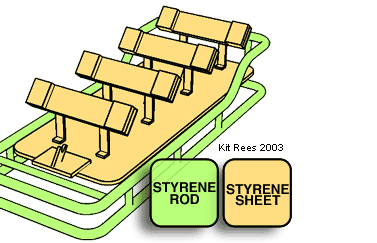 The Holding Rack By merely glancing you can see that is is a simpler shape to understand, but it was harder to build. It is flimsy, and bending plastic rod at right angles is easy but once a rectangle is formed the sides will want to bow out. I cemented in cross rods to the bottom rectangle to hold its sides together. I also omitted the hook shapes on the platform which would cradle the proton packs because the payoff wasn't worth the effort, it's fine without. The plastic rod is the same 1mm Ø used on the pack. In the end it was airbrushed silver, and the pads were hand painted a dark brown. I avoided black pads because the packs were black. Whether the distinction will be seen once the car is complete is a secret held by the future. At this point I give it a "Who cares?" factor of 9.