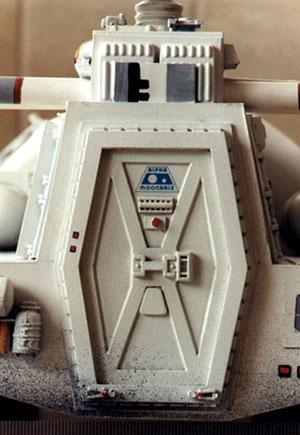 Probably the biggest areas of divergence between SMT's tank and the original is that the cab height is lower. I'd guess the SMT cab is around 1/8" short of the target. That's considerable, on a 4" long kit. This height difference is also apparent in the housing (hereafter referred to as the "utility hump") that sits in the bed. This side view comparison illustrates the difference. Back to the utility hump. The vents on its sides are also not terribly accurate, both in some details and because of the utility hump's shortened height. The only other major inaccuracy that I noted is the rear door. While SMT points out in their instructions that the original went missing, it's not true that no one knows what it looked like. Chris Trice worked with the model's creator, Martin Bower, to restore the original model (read about Chris' restoration). Bower gave him both a description of the original door, as well as some (poor) photos. This is what Chris' restored door looks like. There are other small details that can be added to the cab and overall vehicle (such as the struts behind the dish antenna). I suggest you reference the pictures in the Space:1999 Cybrary to fill in the blanks and add cool, accurate greeblies. Small color reproductions of these same pictures come with the kit. The instructions also go into a brief bit of detail regarding what a modeler would need to do to make the kit match the original. So - Is It Worth The Money? At the SM Reader price of $30 (plus shipping) for 30 resin, 55 injection styrene, and 2 vinyl kit parts, this is a super value. At the catalog price point of $50, it's alright. A good set of waterslide decals would help sweeten the deal. I love kits that get me excited about building them, and this one does that. In the end, that may be what matters the most. To get a look at a build up review of this kit, click this link! Photos of original movie prop are copyright C. M. Trice and hosted on the Space: 1999 Cybrary. |