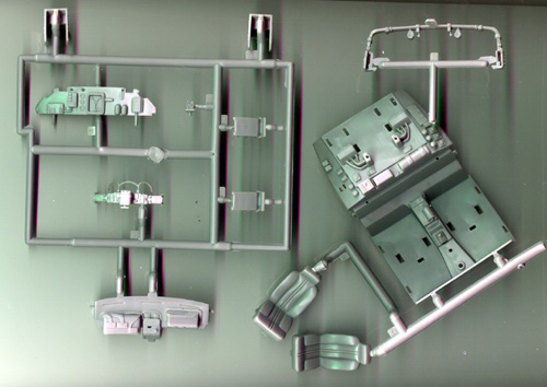 Image: The seond bag holds chromed parts, license plate stickers, tires and axels. Hopefully these tires won't eat styrene over time ... ^ The third bag holds the interior piecesImage: More innards. Not shown are the clear part in its baggie. ^ Aside from the plating and slightly different scale, the new PL kit (foreground) is generally similar to the older Aoshima in quality of detailing ....Image: Though more of the details on the PL are "molded on", vice Aoshima's (bottom) separate pieces. Image: Instructions |