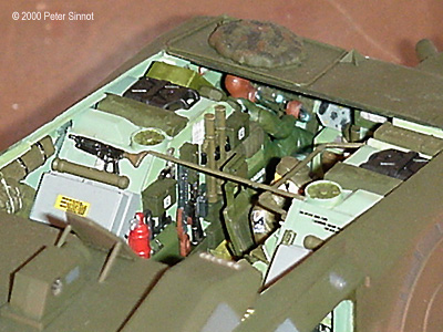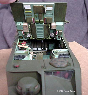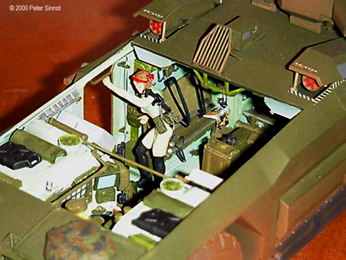 The underside of the center and aft hull sections were detailed with shelves, equipment, red (tactical) and white lighting and miscellaneous details and decals. The Lara Croft-type woman in the troop compartment is from Verlinden's 'Saturday Night Bath' kit. Exterior: External compartments, tarps, jerry cans, crates, cam net w/rack, and sensor mast from various kits and spare parts. Result: Tons of Fun-N-Firepower. |