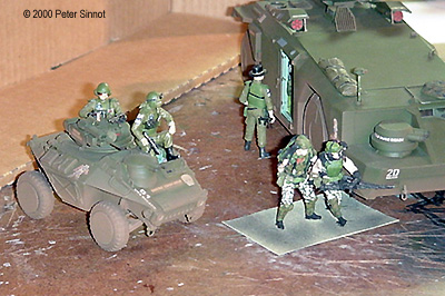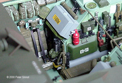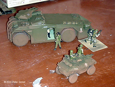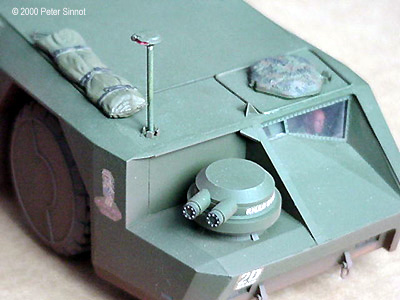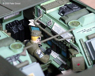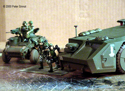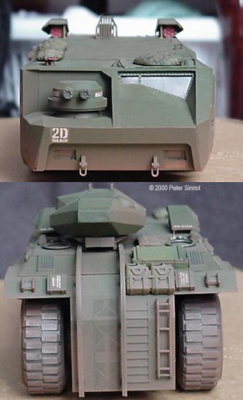 Most parts are flash free but a little clean up is needed here and there. This kit is intended to be built for exterior detail only and has no interior details. I used Testors paints and glue, Crazy Glue, Filler to build it. The decals are very sparse, just two markings to place on this large model. This is due to the lack of exterior markings on the film version. It's no joke, this kit is plain Jane. Try checking out the 1/35 scale Decals from Sub Level 3 (soon to be out of production!). I used both the 1/35th and the 1/72 scale decal sheets and even gave the APC some 'nose art' to spice up the exterior. References: The Aliens movie and the Aliens Technical Manual. The Manual has a lot to say about the APC but no schematics, pictures or diagrams to show the interior details and layout. For my APC I improvised on the interior details which gave me the liberty to go wild. I included combat seating for ten and separate seating for the Driver and Platoon Commander. Modifications My first task was to cut out the sliding door and scratch build a new one. The hardest part was cutting through the hull; this was probably the thickest part in the whole kit, almost 1/8th of an inch in places! The replacement door was made from styrene sheet and slides on telescopic rods. I used styrene rods and aluminum tubing to make a running track for my door to slide on. This I hid in a thickened inner hull wall made of styrene. To keep the door on track and even when sliding open, I had to add several 'runners' at the top and bottom of the door. The second challenge was making space for the driver's cockpit. There was an inner hull wall that stretched the full width of the APC right where the windshield is. In fact, this bulkhead houses the windshield frame. I had to cut almost half of this bulkhead out to open up the driver's pit. Styrene was used to box it up and hide the unnecessary space beneath the forward gattling turret. The next major modification was installing the upper hull multiple missile launchers. The aft hull was cut to give the appearance that these pods can be raised or lowered for firing, storage, or auto reloading. These lower housings are actually the forward flotation/armor from two M-113 kits. Using more parts from other kits I added the hydraulic struts that raise the launchers into the firing position. The rocket pods came from a 1/35th Little Bird (DML) chopper and had to be shortened to fit into their housings. The last major modification to the stock pieces was cutting the upper hull plate into three pieces: Forward (overhead for the drivers cockpit which was glued in place); Center (the removable section above the Command Center); and the Rear section (housing rocket launchers, again glued in place.) where the main turret sits. The Forward section just behind the gattling turret had a small hole drilled into it for the sensor mast. Driver's Cockpit and Command Center I made the floor plates for the command center and driver's cockpit based on the Hummers deck plate from an Italeri Hummer kit. The Driver and Commander seat's are modified Hummer seats with headrests made from a 'Write Protect Tab' from two 3.5" computer floppy disks. The commander's chair has armrests made from the Parts Box. There is an armory of special weapons opposite the Lt.'s command station consisting of RPG's, Plasma Rifles and various small arms, ammunition and storage lockers. The driver's cockpit consists of several instrument panels, the steering yoke, and a bank of video monitors and instruments. The instruments were made from various parts from other kits. The real shame is I didn't cut open the driver's door so all of this could be seen. The Driver is from the US Modern tank Crew kit from DML. The Command Center is an ensemble of electronic information. The console consists of four primary monitors; eighteen smaller displays (two per Marine depending on troop complement) that provide the video feed and vital life signs from each Marine. From here the officer controls the particle beam cannons (main turret), rockets, electronic counter measures, flares and chaff, external sensor mast, and the forward gatling guns. Remote sentry guns can also be tied in and controlled from here. Artillery, orbital/air support and long range communications are also controlled/co-ordinated from the Command Center. The Lt. was made from spare parts from the body box. Troop CompartmentUsing several 1/35th scale M-113 parts, I made the floor plates for the troop compartment. The troops' seats are made from the M-113 troop benches, sand channels covered in tissue paper for backrests and headrests made from M-113 treads. Various ammo and equipment is stored under and on top of the benches, including a video camera, coke can, water bottle, toilet tissue roll, and misc. gear. The aft engine compartment is sealed and closed off with more pieces from the parts box. Just behind the forward wheel wells are two weapons storage racks, note the Pulse Rifles. I kitbashed these rifles from M-16 A2's with M-203 grenade launchers and styrene for the magazines, butts, and carrying handles. This is where the Marines store their weapons during Orbital Drops and over land transport. Shelving above the troop's seats contain missile launchers, light artillery and various ammunition for both ranging from conventional high explosive to low yield nuclear weapons. The heavy ammunition is stored directly over the insulated engine compartment. |