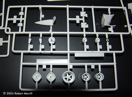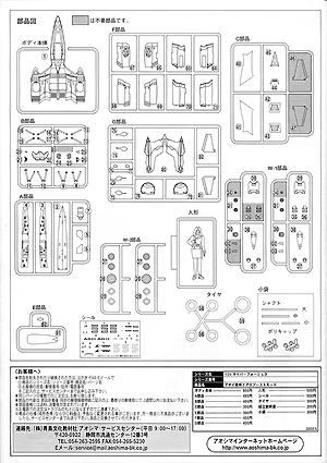 Image: Sprue 1 Image: Sprue 2 Image: Tires, axels and clear parts Image: Sprue 3 Image: Sprue 4 Image: Sprue 5 Image: Sprue 6 Image: Sprue 7 Image: Sure looks like a space fighter .... Image: Figure Image: Line art Image: Body shell and chassis Image: Parts list Image: Decals |