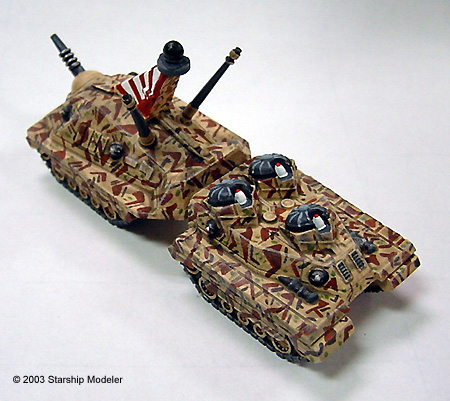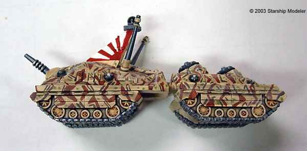 The Ogre has a rising sun emblazoned on each side of the sensor tower, effectively spoiling the pretty rock camouflage. The rest of the tanks will not have this affectation. I’m painting a number of other GEVs and tanks with the same scheme. That’s it, a relatively simple paintjob. I’ve seen good examples of very colorful Ogres on the Steve Jackson Website, so I decided to go more military. Conclusions Ogre is a long-lived game, and like any good game can be played by beginners using simpler rules or by experts using more demanding conditions. The miniatures are sized right to be used with other game systems, like Battletech, if you desire. The only tricky parts on the mini are the track alignment and the joint between hull halves. Just be aware of these, and you’ll have no problems. Many thanks to Paul Chapman at Steve Jackson Games for the review copy. Now I must obtain more Ogres… |