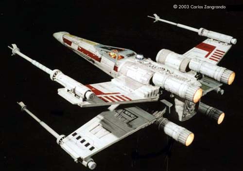 One of the most interesting aspects of the STAR WARS movies is the starship designs. Most came from the magic pen of master Ralph MacQuarrie. The Incom Corporation T-65 Fighter, or X- Wing fighter, has become one of my favorites. Just after the releasing of the movie, MPC got the rights and released a model of the X-Wing, in 1/48 scale. It's a fairly good model, and up to the best model standards of the time. In the 90's, ERTL announced the release of a "special edition" X-Wing model, in their ProShop line. With much anticipation, I ordered mine as soon as it was released and ... what a disappointment. Yes, the model has interesting features, such as a voice chip with original lines of the movie, and two motors and gears for the wings and cockpit canopy. But the detail is POOR... I mean, REALLY POOR. Even the shape of the fuselage is wrong! It seems to me that, in order to cut the costs, they hired a poorly skilled craftsman to make the patterns for the molds, or simply didn't care too much about it. Even the old MPC 1/48 version, despite all faults, is much better detailed. Well.... Since I spent a lot of money on the thing, I really had to do something with it. So I decided to scratch as much as I can, in order to get a better and large version of one of my favourite spacecrafts of all time. I decided to do the famous RED 5, to represent the famous Death Star trench sequence. Assembly and Modifications First, I re-scribed the entire fuselage, glued some plastic ships for the box cover details, and cut away the detail section behind R2-D2 station. I cut the nose cone detail from the upper fuselage piece, and glued to the bottom fuselage. Then the fuselage bottom was re-scribed, and some bits of styrene sheet glued. I filled and sanded the diamond shaped support hole and also extended the back of the fuselage a little. Here you see the main connector (female) which will connect the model to the base, so the model can be removed for play... errr... "transportation". That strange "six wires" coming out of the starboard are secondary power connections, which will become hidden beneath the "wing" (never trust only one power connection! ).Here you see the interior of the bottom fuselage, with all wires running through it. I've reworked the nose cone, and rebuilt the "sensor window" and the photon torpedo launcher. I then reworked the bottom of the wings, sanding all the wrong detail, and reshaping the wing openings to a more correct profile. The back of the wings were also rebuilt, according the details from the actual filming miniatures. The trench was made using an U shaped styrene strip. The upper side of the wings were severely reworked next. I sanded away most of the detail, re-scribed and made new detail from sheet styrene. The laser cannons were rebuilt, using styrene tubes, and new detail cut from styrene sheets. The alignment was assured using a steel rod running all through the center of the tubes and model kit part. Next I made a new detail part for the deflector shield and hyperdrive generators, behind R2's position. It was made with styrene sheet and lots of bits from my spare box. The back detail was also reworked. I also made a new cockpit canopy from sheet styrene. Only the back of the original piece was used. Surprisingly, the cockpit is fairly good. I rebuilt the computer (?) behind the seat. Note that a trench was left in order to allow the canopy opening mechanism. I also reworked the seta (?) and the headrest. The pilot figure is very good, but represents a well known photo of Luke when he crashes at Dagobah, in "The Empire Strikes Back". The uniform is the same, but if you want to build a Star Wars version, you must paint the gloves black. I then made a black box from styrene, with a clear plastic end. It became become the main cockpit display, with lighted instruments. The main engines parts are ridiculously wrong! I had to build new ones from scratch. The only kit parts I've used are the engine nozzles, which were drilled out and thinned from inside. The engines were painted black to avoid light leaks. New engine "intakes" were built as well using sheet styrene. New engine details, which will be used at the inner part of the wings, were built from styrene sheet, strips and half-rounds strips. The four cooling sleeves at the sides were cut from a cheap plastic pencil sharpener I found at the supermarket. Here you can also see my R2-D2 unit. I cut the dome from the kit supplied part, sanded all detail and glued it to a styrene tube. R2's arms were attached later. My last modification was the male connector, which will be permanently fixed at the base support. It's a six pin computer monitor gold connector. Paint and Decals I painted the model using acrylic paints, and carefully weathered it to approach the Star Wars "look". I printed my own decals, using my old and reliable Citizen 600C dry-printer. The decals were scanned from the Finemolds decal sheet, and resized to properly fit the ERTL model. It's a 100% improvement over the horrible original ERTL decals! I still have all scans. Anyone interested, please feel free to PM me (Arthur Pendragon on the Discussion Forum), and I'll send a copy. Display I've used the original base, but made a new support, which doubles as a electrical connector. I really believe that the base must be simple and elegant, in order to do not drive away attention from the model. Electronics and Wiring Surprisingly, all the electronic gizmos work pretty well. The base-mounted chip has some cool features, including Vader's voice ("I have you now! " and "Don't make me destroy you"- which is a line from TESB, not SW), Luke's voice ("Red Five Standing by..." and "I'm Luke Skywalker"), and some other sounds. The lights and motors also worked OK. Electronic novices may need some help to install the electronics, but I found the task fairly straightforward. Final Words It took me four months to finish this model... the result was worth all the time and 