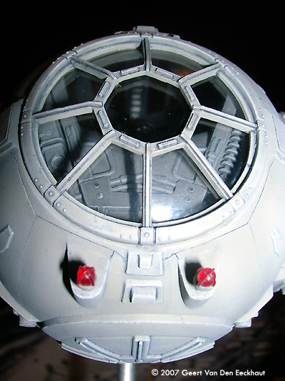 Step 7: Fuselage Upper Half. I dealt with all the boxes in step 4. I glued the hatch to the upper part of the fuselage half and started worrying for step 8.Step 8: Closing Up the Fuselage Well a new problem came in sight. The fuselage has two holes in the shape of a trapezium. Normally you should glue -before closing the two halves- four walls on the lower fuselage. These close the gap between lower and upper halves. I let the details on these parts inspire me to make my own. I first glued the halves together, then glued the walls in place. These were voluntarily made too large so that I could cut them to the appropriate size when installed. And then I got myself scratching the details so that these would become a point of interest for the viewer. The eyeball windshield- again I used the kit part as a mould to heat form a new one much thinner and much more transparent. You can glue this with Kristal Clear to its frame. Again I followed Ward's advice and rescribed all the panel lines, remember you have to create those on the eyeball itself, AMT forgot them. Use the drawings from the official Star Wars Fact File on the advanced Tie Fighter. The other parts left do not present a problem, just the back plate doesn't fit. I sanded this part down so that I rescued the details molded on this part which I glued to the new one made from plastic card. Step 9: Solar Panels Not much to be said. I sanded all the sides. They are too thick so I got them thinner, more to scale and replaced the small ribs on the outer side of the panels with new ones. Step 10: Blasters Once I bought a small set from Rocco with light bulbs in different colors: blue, red and orange. They were meant to dress up cars in HO scale. This set always came in handy. I cut off the plastic representation of the guns and put two new laser guns in place, made of transparent red plastic. Step 11 & 12 - In Flight Display Since I never meant to squeeze my Tie into a piece of Plexiglas, I skipped these steps. Done! And now the paint job. |