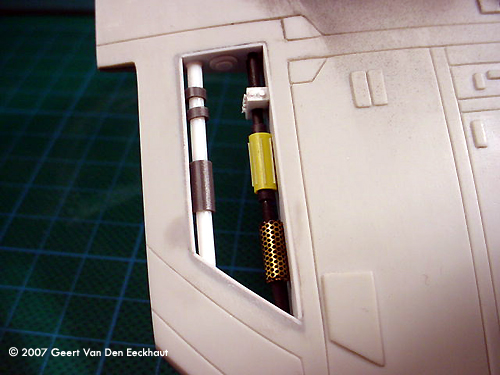Why not a Star Wars kit? Something easy, I thought, I was looking for a simple kit to build without existing photo etching and lots of documentation. This was going to be a real modeling exercise, no update sets, just me and the kit. I took a quick look at the internet and stumbled in to Ward's article and got hooked. Since I was looking to build Darth Vader's Tie I used this article as a step by step guide and tried to do better (who am I?) There where Ward was not pleased with his choices I tried to come up with something more suitable from my point of view. Before I will loose myself in details I just want to say “thanks” to Ward for his complete and inspiring article. I am not rewriting his article, that would be a waste of time, after all he wrote some 15 pages! I'll take you on tour following the same sequence as the AMT ERTL plan. Here we go. Step 1: Darth Vader He's ugly, yes indeed! I gave him new eyes therefore I drilled his old eyes out from the inside of his head and put small balls in place, leaden balls, the kind fishermen use on their lines. I sawed off his hands and replaced them by a set with gloves on from Verlinden and finally I put a new strip on his helmet together with new bolts on his mask (mouth). I did not know how much one still could see once the cockpit was closed and illuminated --- and then I had the idea of putting electro luminescence sheet in it. Step 2 & 3: Cockpit I followed the kit instructions but included a backlight. The back side of the cockpit wall was sanded until I only got the ribs of what I called the aim. Then I took the electro luminescence sheet and cut it to shape. You have to be sure to include two connections on your shape to connect a little transformer to - you need a plus and a minus. The set, bought on the site of Micro-Mark, comes with a small switch, the transformer and a housing for two batteries. Once switched on, this sheet glows and gives off a bluish light. Other modelers use it to reproduce the bluish light of warp engines. I wanted Darth Vader to sit in his cockpit poorly lit like in the movie but just enough to catch a glimpse of the cockpit and this great character. Since I had already decided to put this model on a aluminium tube more or less in a flying situation, this tube served to lead my two wires down to my control box with the switch, transformer and batteries. Any way, don't use the landing gear included in the kit, ever saw a TIE skiing? Step 4: Fuselage Lower Half Ok, here started the troubles but luckily I learned from Ward's experience. I did throw away the six recessed boxes and started to make my own using the bad ones as a template. I wanted to be able to look into the recessed areas; I couldn't imagine looking upon a wall in that particular place. So for the four small ones, I made boxes with plastic card which I glued to the inner side of the lower and the upper fuselage copying the tubing present on the bad pieces. I did more or less the same thing for the two other boxes but these ones sit on the front of the fighter. So these had to be good, real good. In the picture you can see that I created a large surface with many details; it covers almost the whole length. Even an experienced eye can look into these holes and will see nothing else but hidden details of the tie fighter. I created it with tubing of different size and material and glued it in place. The last thing added in this step was the finished cockpit. Step 5: Hatch In one word “bad”. You'll have to glue a transparent part to a plastic one and than you have something that should look like a hatch. I used the plastic part as a mould for heat forming another one. If you do it correctly you will even have a very small recess around the four small windows. A couple of smaller details were added and finished. The windows were sealed with Tamiya masking tape for the future paint job. Step 6: Landing Gear Quick! Throw it away! Don't get spoiled by bad taste and move to step 7. I closed the holes provided for the landing gear with plastic roundels. You can make these easily with a punch & die set. |