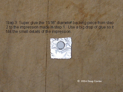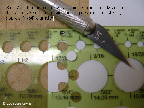 Step 2: Cut some round backing pieces from thin plastic stock, the same size as the docking port impression from step 1, approx. 11/64” diameter. Step 3: Super glue the 11/64” diameter backing piece from step 2 to the impression made in step 1. Use a big drop of glue so it fills the small details of the impression. |