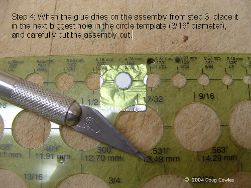 Step 4: When the glue dries from step 3, place it in the next biggest hole in circle template (3/16” diameter), and carefully cut the assembly out.
