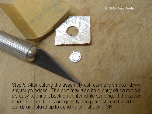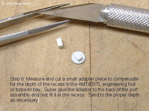 Step 5: After cutting the assembly out, carefully smooth down any rough edges. The port may also be slightly off center but it's easy to bring it back on center while sanding. If the super glue filled the details adequately, the piece should be rather sturdy and stand up to sanding and shaping OK. Step 6: Measure and cut a small adapter piece to compensate for the depth of the recess in the AMT/ERTL engineering hull of torpedo bay. Super glue the adapter to the back of the port assembly and test fit in the recess. Sand to the proper depth as necessary. |