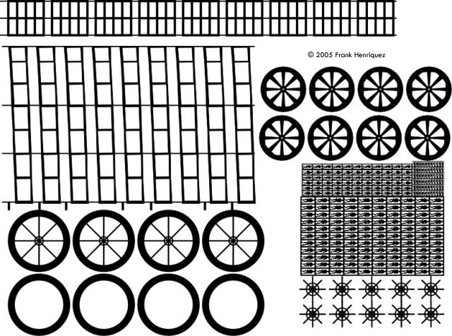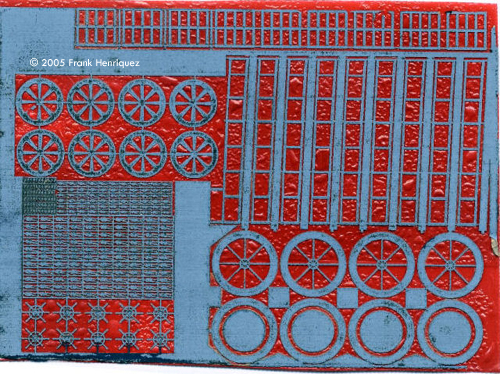 The Process With all the required equipment in place, you're almost ready to start. Mix the etching solution as described above. Remember to wear safety equipment, and only mix the chemicals in a well ventilated area. The muriatic acid will release a pretty strong vapor that you don't want to breathe in. Secure the etching mix in a safe place. The rest of the process seems simple - draw the artwork, print it onto the Press N' Peel material, iron or laminate the Press N' Peel onto the brass and etch the results. I would usually suggest to “go and experiment” because I always learn from my mistakes. However, the Press N' Peel material is pretty expensive, and the process of getting the toner onto the brass a minefield of potential screwups, so I have some suggestions that'll make the process easier. The Artwork To get the best results, you have to be aware of the limitations of most laser printers. The first is that laser printers only print in black (toner is placed on the paper) and white (no toner is placed on the paper). Grayscale is simulated by halftoning - printing small dot patterns of varying diameters and densities to simulate a grayscale. Your PE parts should appear solid black in your artwork. I've experimented with halftoning using Press N' peel Blue, but the results have not been encouraging You can make the artwork in any size, but it has to be resized to fit onto the Press N' Peel sheet. Minimize the amount of brass that has to be removed. The less brass that has to be etched away, the quicker the etching, and the longer your etching solution will last. I use 0.003” to 0.005” thick brass, and I surround the parts in my artwork with black. I also run thin “sprue” lines from the black surrounds to the parts. On the two examples of artwork at left, the black areas represent the brass parts; they won't be etched. The white (or clear) areas represent the brass that'll be etched away.Group PE parts by complexity. Small and simple parts will etch faster than complex parts. A good example are the 1/1000, 1/1400 and 1/2500 figures in the good artwork figure. The ship wheels and large brass circles were completely etched long before the figures. I didn't want to over etch the larger parts so I took the brass sheet out of the etching solution. I cut out the figures and will complete etching them separately at a later date. Smaller sheets are better than large sheets. When I make a set of PE parts, I'll print out the artwork, transfer it to the brass, then trim the sheet into smaller parts. Redundancy and repeating parts more than once is good. You'll rarely get 100% yields with this process, even when using a laminator. I usually make two, three or even more copies of a part on each sheet, depending on the part's complexity. It's a lot simpler to store extra parts for a future project than to have to re-etch a sheet because the one part you needed didn't come out. Print to Press N' Peel Once the artwork is complete, print out a copy on regular paper, just to verify that everything is where it should be. Next, load a sheet of Press N' Peel blue into the printer, so that the artwork is printed on the dull side of the sheet. You don't have to cover a sheet with artwork. Don't throw away the unprinted parts of the Press N' Peel Blue! You can tape a strip of Press N' Peel Blue to a regular sheet of paper. Prepare the Brass Toner particles stick well to brass, but the environment in the etching solution is pretty brutal, even to the little toner particles. To help them hold on as everything around them is dissolving away, the brass sheet must be clean and free from dust, oils and oxide. Use the green side of a clean Scotchbrite pad to scour the side of the brass that'll receive the artwork. Rinse the brass with water, then rinse it with some denatured alcohol or acetone to remove any traces of oil from your fingers. Avoid touching the clean side of the brass, and make sure that it's fully dry before running it through a laminator or placing it under a hot iron! Transfer the Artwork With a laminator, it's simple. I place the toner side of the Press N' Peel sheet onto the clean brass surface, then tape the corners and edges so that it's in good contact against the brass. I then run the brass and sheet through the laminator. I do not use the laminator pouch, but just run the bare brass and Press N' Peel sheet through the machine. The combination sheet will come out the other side in about 20 seconds. I usually run it through a second time, to make sure that the toner has fully transferred to the brass. Transferring the artwork with an iron takes much more time and it's more of a trial and error process. The Tekniks page covers the details. Protect the Brass While it's possible to make a double sided PE sheet, most of the time you'll be making a single sided sheet, with the artwork on one side and bare brass on the other. The bare side must be protected, otherwise you'll etch the brass away completely! After ironing or transferring the Press N' Peel sheet, but before removing the mylar carrier from the brass, I paint the bare side of the brass sheet with paint. I've used Mr. Surfacer, because it was handy, but I've recently started using Testors red Acryl paint. I brush on the paint, allow it to dry, then touch up the thin spots. Once the paint has fully dried, I protect it with 2” wide clear plastic packing tape, with a slight overlap between the strips. I make sure that the tape is down securely; you don't want the acid solution to creep in under the tape. The red paint color isn't a random choice; it makes a great indicator of the etching progress, since it contrasts vividly with the unetched brass and the toner protected brass artwork. When everything looks red, the etching is done. Trim the Brass Remember, you want to minimize the amount of brass that must be etched away. Once the back side has dried and has been taped over, I remove the Press N' Peel carrier sheet and cut th