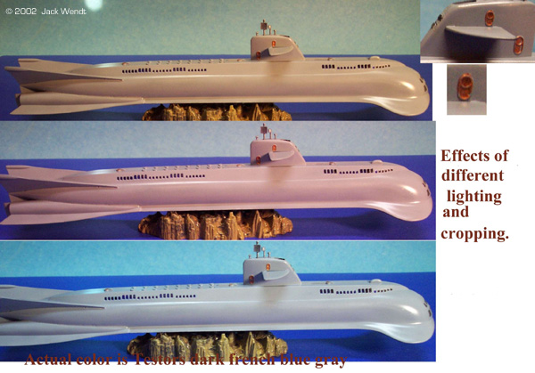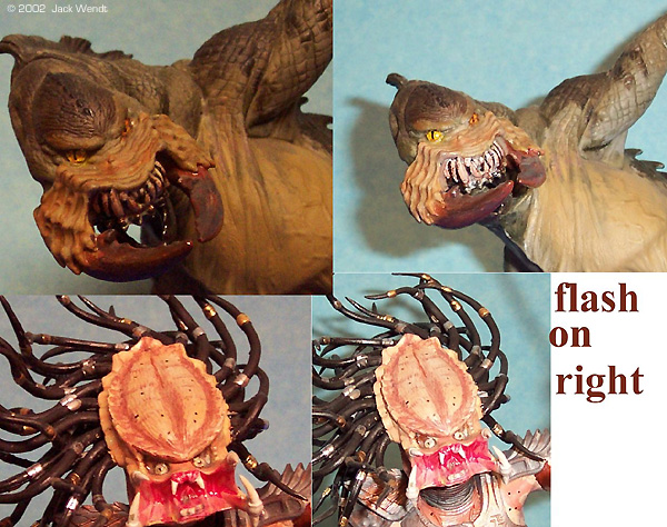 Other Concerns Digital cameras see objects differently then 35 mm camera. Digitals interpret light and colors sometimes differently. This is hard to describe so it is "show and tell." Take a look at the Seaview model that I took pictures of. Various light settings were tried. The color that I chose for Seaview is, as listed on the picture, Testors French Dark Blue Gray. ![]() Rick Cantu built and entered the above in the Model Fiesta near San Antonio on February 23, 2002. The pictures on the right are with flash. The ones on the left are without. I did not adjust the white balance, and all models were shot under fluorescent light, including his. Here are pictures of Kothoga and Predator with the same examples, but different outcome. This problem reminds me of the endless discussion of what color is our favorite starships. Those that go to the Usenet or the discussion forum on this site know exactly what I mean-- think of the heated discussions of what is the actual color of Voyager, 1701, 1701A, 1701E, etc. The white balance can change the color of the model, regardless of film or digital. Also, digital photographs cannot be cropped and magnified as much as a 35 mm photo that has been scanned in and severely cropped. In a camera such as mine, you can crop the surrounding areas, but cannot take a 1" section of the photo and blow it up 100 percent as can be done with photo film scanned into a computer at a high resolution. With digital at a setting of 3.1 mega pixels, you can blow up at least 50%, after cropping. Remember something that folks cannot get their heads around sometimes and that is your monitor/camera resolution. Some people still have their monitors set for 640x480 resolution. This is the bare resolution for most modern monitors. This is equivalent to .3 mega pixels, or in that range. A higher setting will result in a better view of your pictures, more lines of resolution, and crisper detail. Folks, a good monitor is a High Definition Television, only with a small screen. With the camera I have, the resolution of each picture is 2160x1440. On a 19" monitor, at its highest resolution, a picture will fill up the entire screen. I have my monitor set at 1152x864. You notice in the 2.2 setting that this camera will take 8X10" photos. Remember people that take the 4x6" picture of a subject, scan it in to the computer, and resize to 8x10," have all these steps to go through. With a digital, you plug your camera into the computer, and in about a minute or less you can download the entire storage device onto the computer for viewing. Good photo processing software such as Ulead Photo Express, allows the user to "scale" the image down to the size requested in printing. In other words, by simply telling the computer you want to print the object on a 4x6" photograph paper, the computer will scale the image to fit the paper with little effort on the operators part. I do not feel that the images seen at the highest resolutions will print at the same level of quality, but if the image is scaled down to say 4x6" size for printing, the image are comparable to what is seen in 35 mm film. One bad thing is that when you take a picture of your model as close as a digital will allow with macro turned on, you see every little thing that is wrong. Every little seam line, spot of filler, and brush stoke is made visible. I got my camera for Christmas, and have pretty much mastered (or I think I have) it over the last couple of months. The retail price in 12/2001, was around $399. I got my camera, including shipping off the Internet for about $350. I am not a professional photographer or even in the same county as one, but these are just my observations and what I have learned recently. So what should you look for in a camera? There are different ways to download from camera, but most come equipped with an USB connector and many will save pictures straight to a ploppy disk. If yours does not have this and relies on a slower process such as a parallel port, there is a stand-alone devise (card reader) that reads different storage devises, (Compact Flash, Smart Media) without the camera being connected to the computer. For saving batteries, this stand-alone reader might be a good investment for some. Well you really don't need much higher mega pixels than about 3.1. In fact you will be probably just as happy with a 2.1 or higher cameras. Anything over 3.1 in my opinion is overkill. Maybe a professional needs it, but not the average person. Notice the spec on this 3.1 Straight from the camera, this picture will fill up my entire 19" screen, and will look sharp. The specification above can be found on the Internet, which are general for most digital cameras. I don't know if a 2.1 can take an adequate picture for an 8x10, but it will take an exceptional picture for 4x6 development. You can find a 2.1 mega pixel camera with all the below options for under $300, over the Internet. Get a camera with a macro setting. This is a little button you push or switch you slide, which allows you to take pictures from 2 inches to 2 feet away. This switch or slide is usually represented by the icons for a mountain (infinity setting) and a flower for the macro setting. This allows you to get detail that only a more expensive SLR or bridge camera with special lenses can offer. The SLR lens can cost more than the digital camera you need for photographing your model kits. In the macro setting, the small viewable screen is usually on. This can drain a battery quickly, so take your shot and turn off the camera. The Kodak cannot get up to within 2" like some of the more expensive digitals or SLR, but when the resolution is as high as this camera, you can get a lot of detail on a small object from 6" away. The camera should, and most do, allow you to turn off the flash. When taking pictures as close as you will be able with a camera such as this one, the flash can really wash out the color, making it hard for the observer to know w